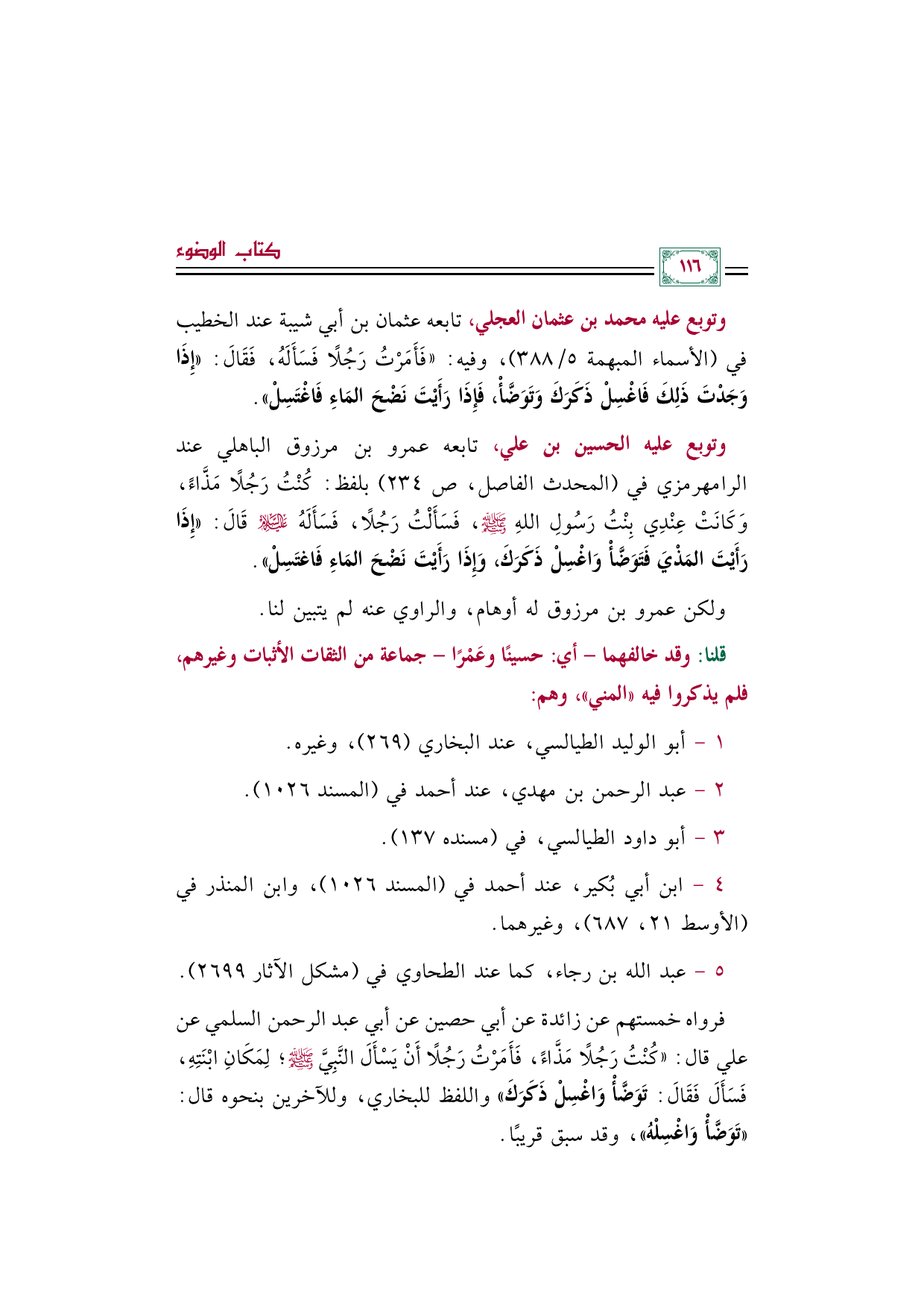 وتوبع عليه الحسين بن علي، تابعه عمرو بن مرزوق الباهلي عند الرامهرمزي في (المحدث الفاصل، ص ٢٣٤) بلفظ: كُنْتُ رَجُلًا مَذَّاءً، وَكَانَتْ عِنْدِي بِنْتُ رَسُولِ اللهِ صَلَّى اللهُ عَلَيْهِ وَسَلَّمَ، فَسَأَلْتُ رَجُلًا، فَسَأَلَهُ عَلَيْهِ السَّلَامُ قَالَ: «إِذَا رَأَيْتَ المَذْيَ فَتَوَضَّأْ وَاغْسِلْ ذَكَرَكَ، وَإِذَا رَأَيْتَ نَضْحَ المَاءِ فَاغتَسِلْ».