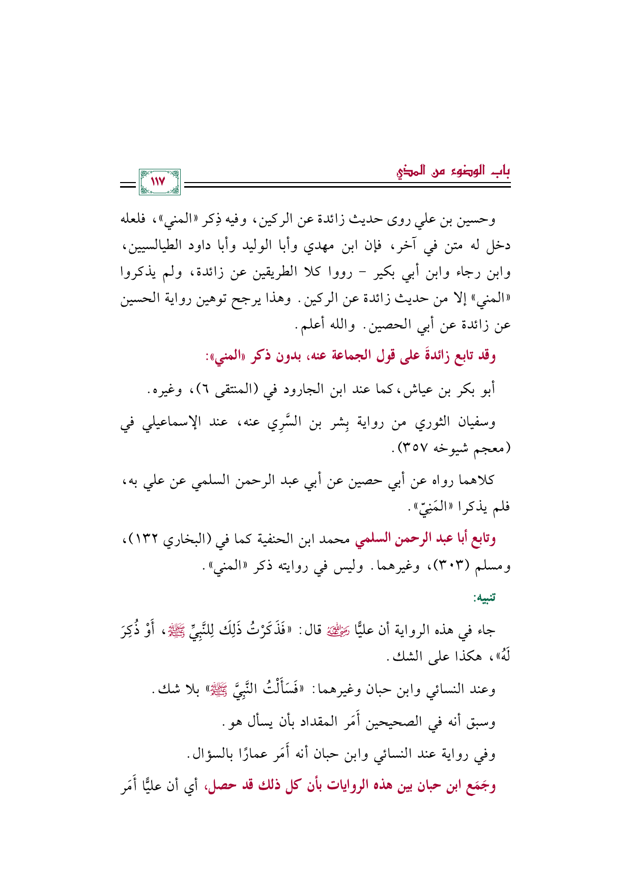 وتابع أبا عبد الرحمن السلمي محمد ابن الحنفية كما في (البخاري ١٣٢)، ومسلم (٣٠٣)، وغيرهما. وليس في روايته ذكر ((المني)).