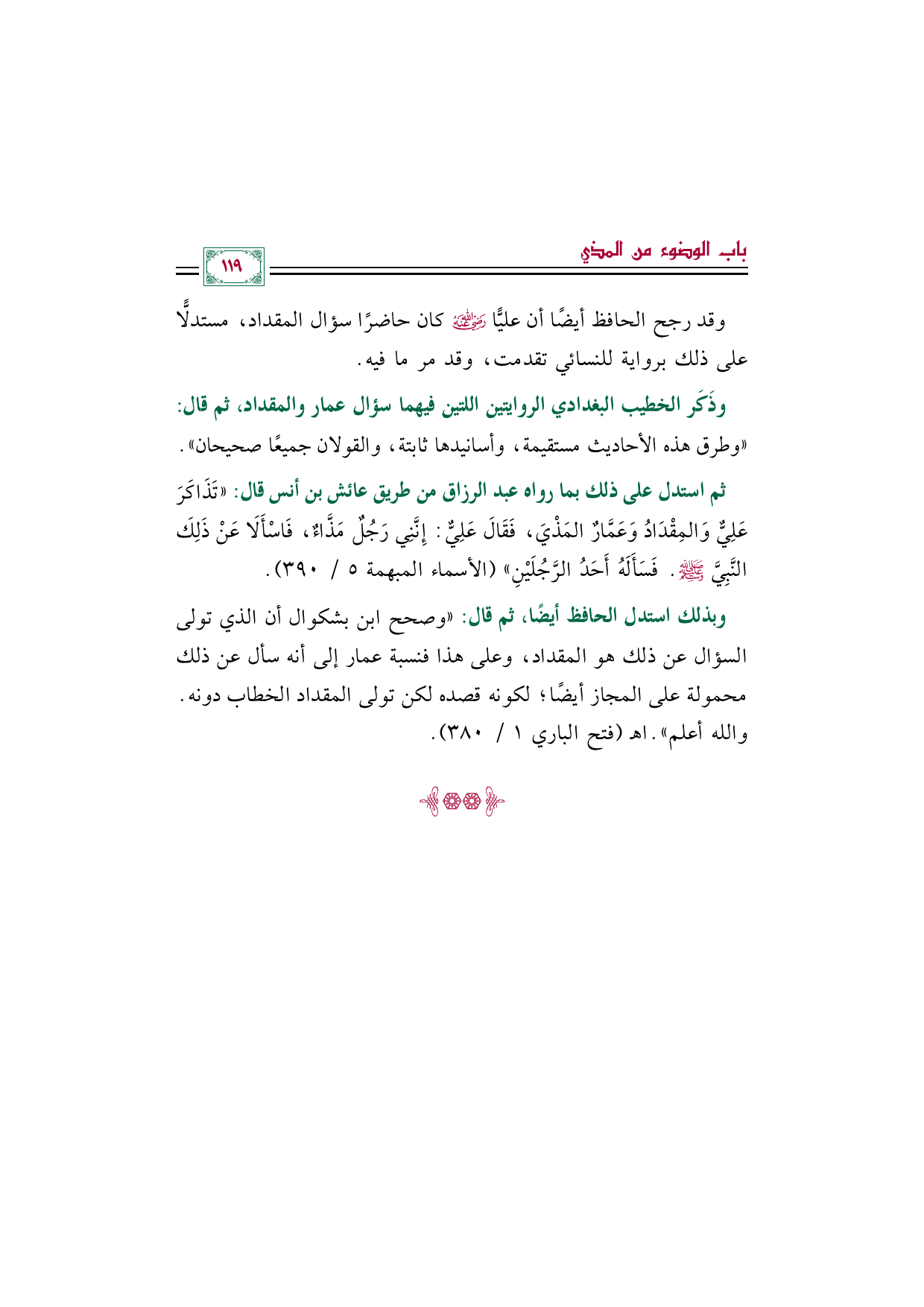 وقد رجح الحافظ أيضًا أن عليًّا رضي الله عنه كان حاضرًا سؤال المقداد، مستدلًّا على ذلك برواية للنسائي تقدمت، وقد مر ما فيه.