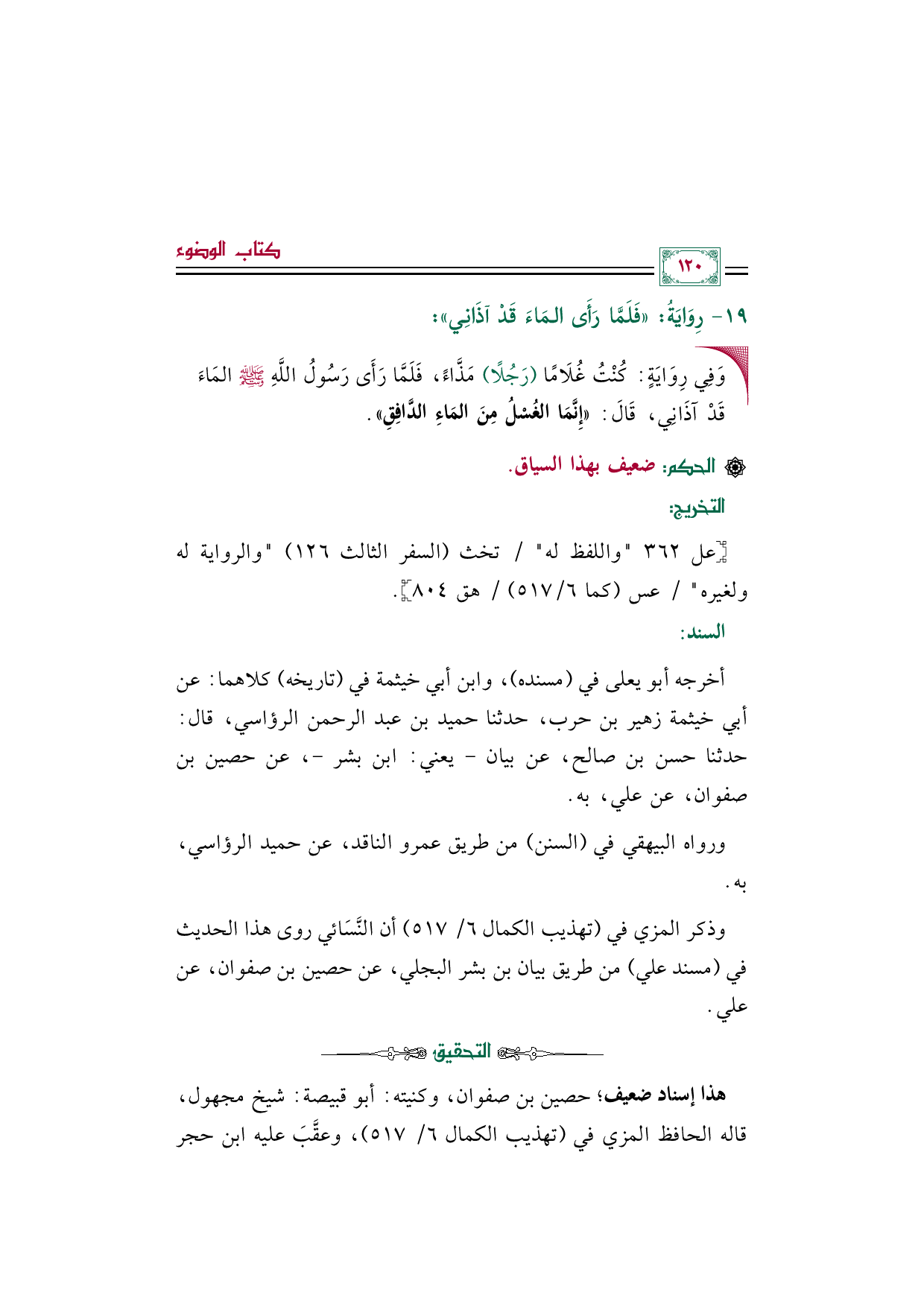 وذكر المزي في (تهذيب الكمال ٦/ ٥١٧) أن النَّسَائي روى هذا الحديث في (مسند علي) من طريق بيان بن بشر البجلي، عن حصين بن صفوان، عن علي.
