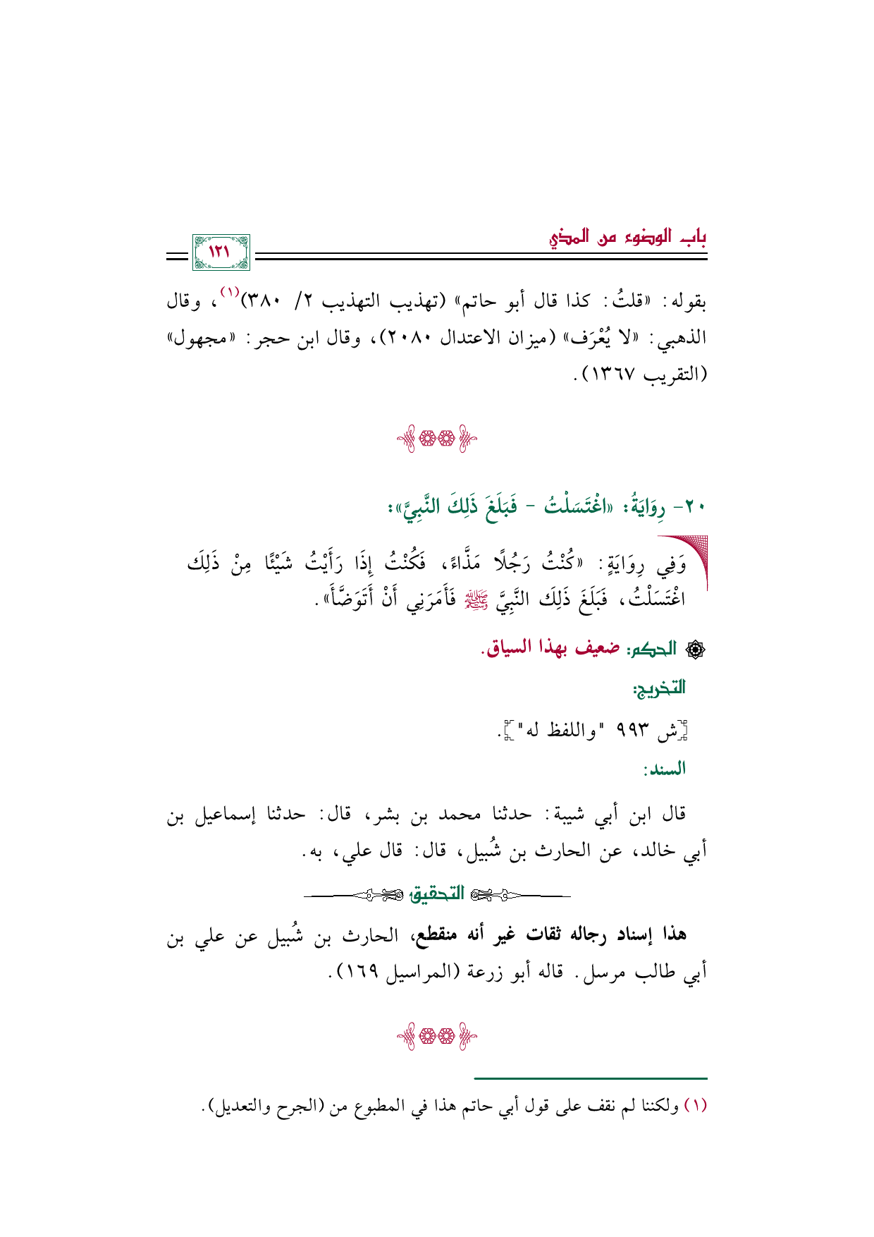 هذا إسناد رجاله ثقات غير أنه منقطع، الحارث بن شُبيل عن علي بن أبي طالب مرسل. قاله أبو زرعة (المراسيل ١٦٩).