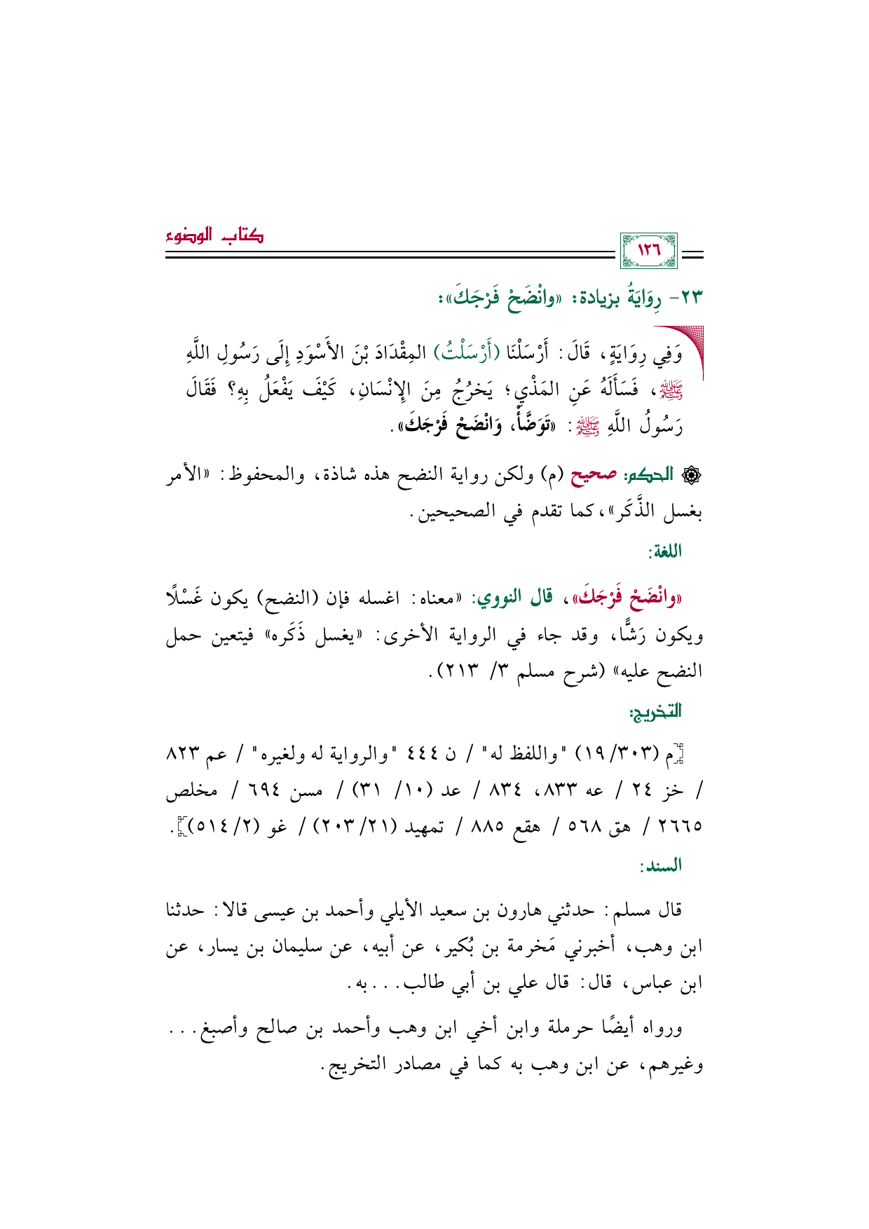 ((وانْضَحْ فَرْجَكَ))، قال النووي: "معناه: اغسله فإن (النضح) يكون غَسْلًا ويكون رَشًّا، وقد جاء في الرواية الأخرى: ((يغسل ذَكَره)) فيتعين حمل النضح عليه" (شرح مسلم ٣/ ٢١٣).