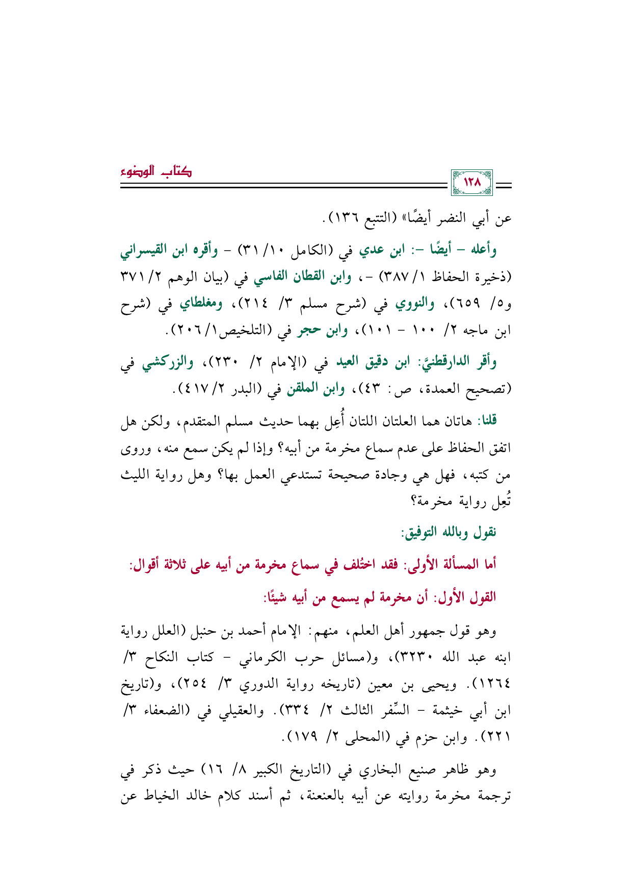 قلنا: هاتان هما العلتان اللتان أُعِل بهما حديث مسلم المتقدم، ولكن هل اتفق الحفاظ على عدم سماع مخرمة من أبيه؟ وإذا لم يكن سمع منه، وروى من كتبه، فهل هي وجادة صحيحة تستدعي العمل بها؟ وهل رواية الليث تُعِل رواية مخرمة؟