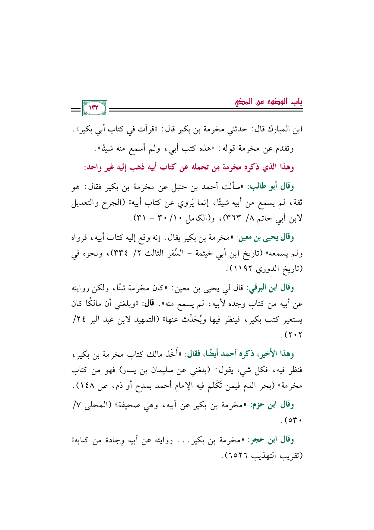 وقال أبو طالب: ((سألت أحمد بن حنبل عن مخرمة بن بكير فقال: هو ثقة، لم يسمع من أبيه شيئًا، إنما يَروي عن كتاب أبيه)) (الجرح والتعديل لابن أبي حاتم ٨/ ٣٦٣)، و (الكامل ١٠/ ٣٠ - ٣١).