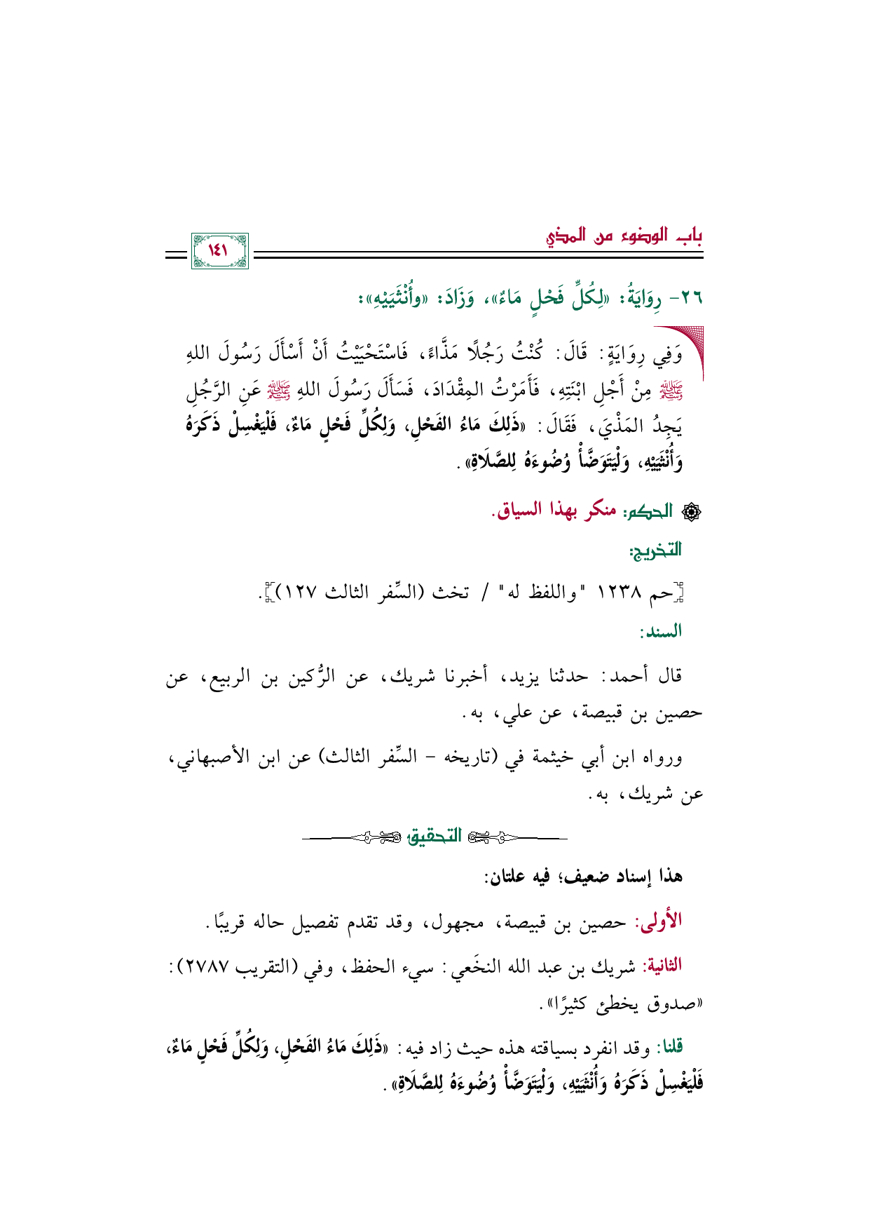 قلنا: وقد انفرد بسياقته هذه حيث زاد فيه: ((ذَلِكَ مَاءُ الفَحْلِ، وَلِكُلِّ فَحْلٍ مَاءٌ، فَلْيَغْسِلْ ذَكَرَهُ وَأُنْثَيَيْهِ، وَلْيَتَوَضَّأْ وُضُوءَهُ لِلصَّلَاةِ)).