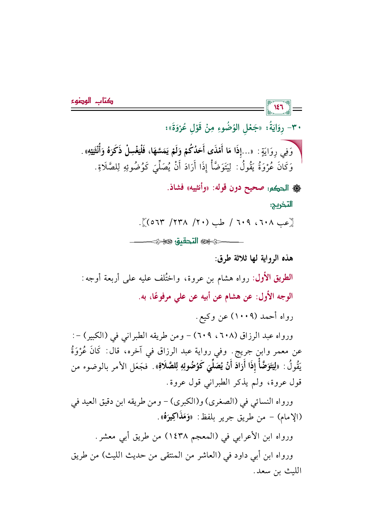 ورواه عبد الرزاق (٦٠٨، ٦٠٩) - ومن طريقه الطبراني في (الكبير) -: عن معمر وابن جريج. وفي رواية عبد الرزاق في آخره، قال: كَانَ عُرْوَةُ يَقُولُ: «لِيَتَوَضَّأْ إِذَا أَرَادَ أَنْ يُصَلِّيَ كَوُضُوئِهِ لِلصَّلَاةِ». فجَعَل الأمر بالوضوء من قول عروة، ولم يذكر الطبراني قول عروة.