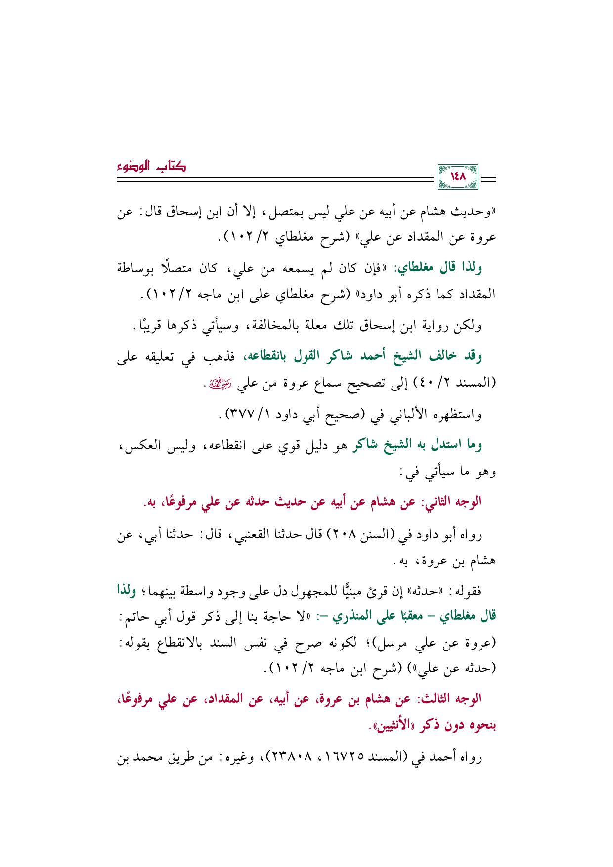 "وحديث هشام عن أبيه عن علي ليس بمتصل، إلا أن ابن إسحاق قال: عن عروة عن المقداد عن علي" (شرح مغلطاي ٢/ ١٠٢).