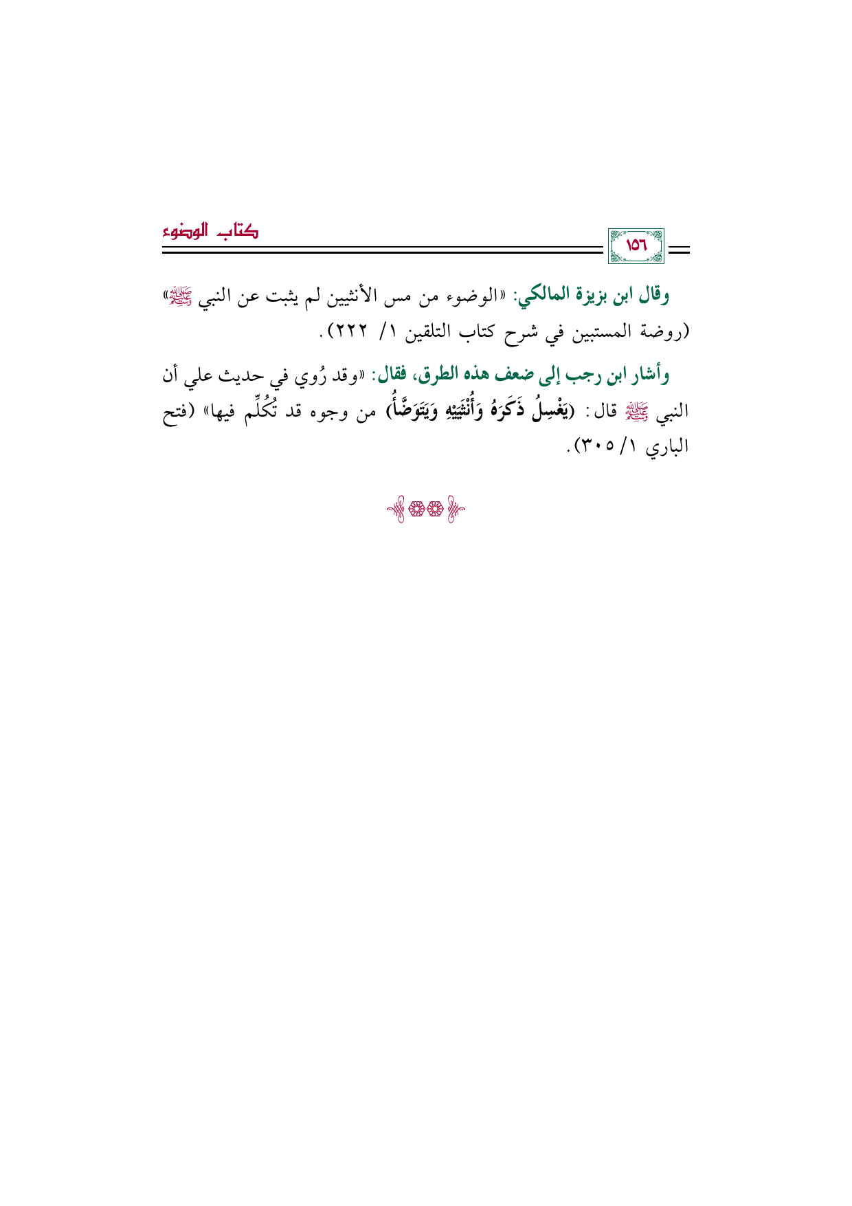 وأشار ابن رجب إلى ضعف هذه الطرق، فقال: ((وقد رُوي في حديث علي أن النبي صلى الله عليه وسلم قال: (يَغْسِلُ ذَكَرَهُ وَأُنْثَيَيْهِ وَيَتَوَضَّأُ) من وجوه قد تُكُلِّم فيها)) (فتح الباري ١/ ٣٠٥).