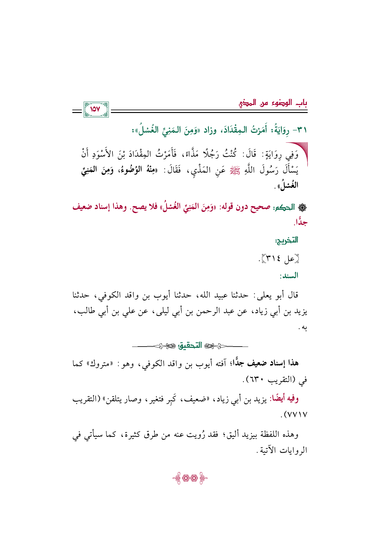 [الحكم]: صحيح دون قوله: ((وَمِنَ المَنِيِّ الغُسْلُ)) فلا يصح. وهذا إسناد ضعيف جدًّا.