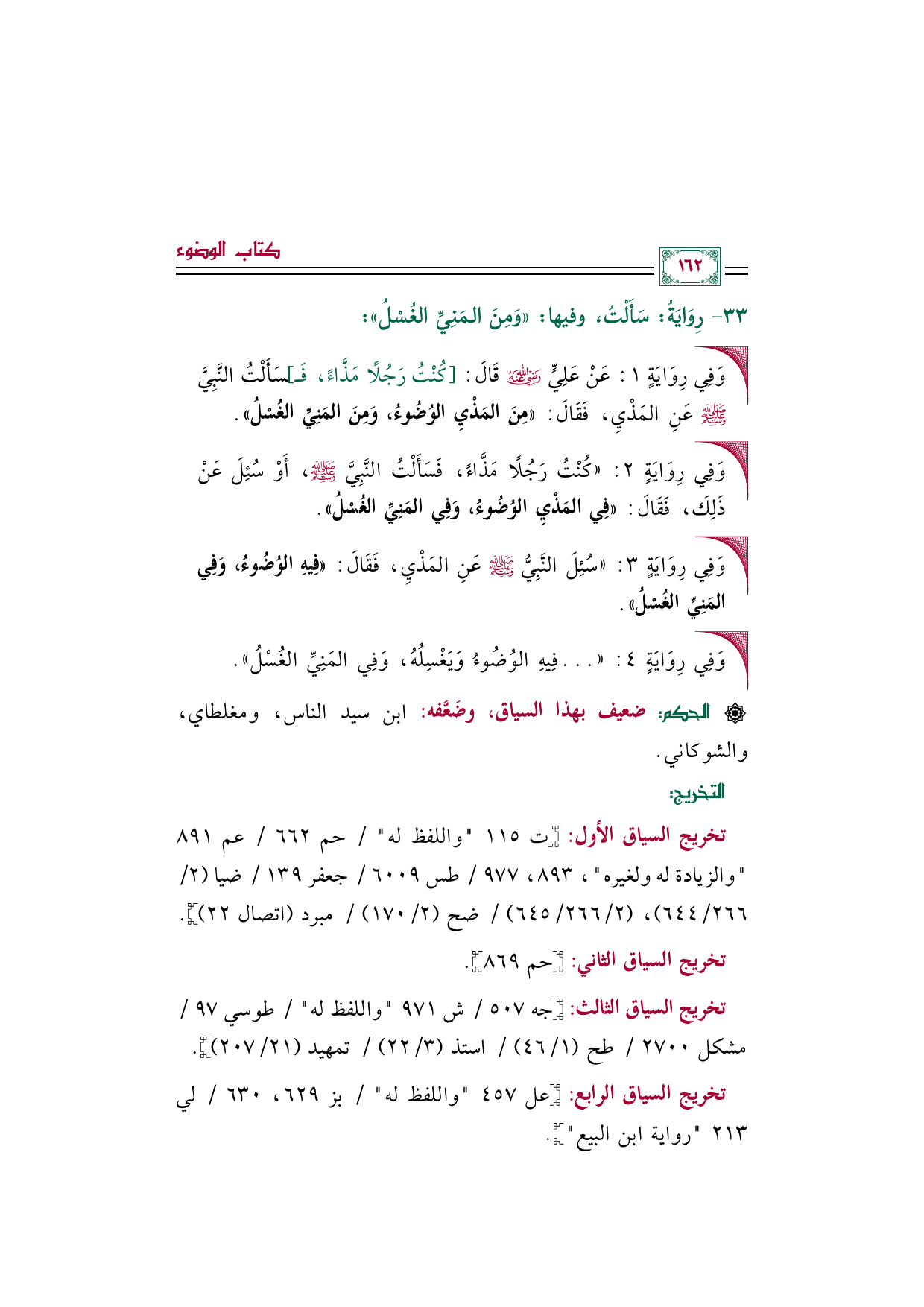 • وَفِي رِوَايَةٍ (٣): ((سُئِلَ النَّبِيُّ صَلَّى اللهُ عَلَيْهِ وَسَلَّمَ عَنِ المَذْيِ، فَقَالَ: ((فِيهِ الوُضُوءُ، وَفِي المَنِيِّ الغُسْلُ)).