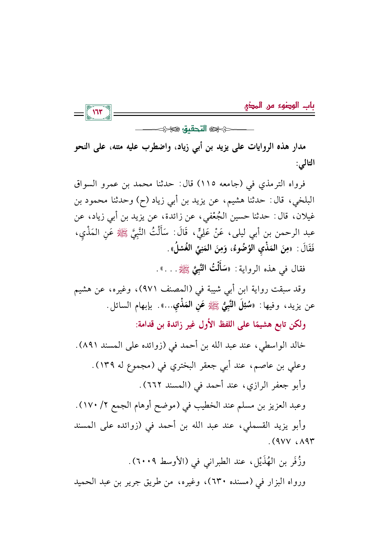 فرواه الترمذي في (جامعه ١١٥) قال: حدثنا محمد بن عمرو السواق البلخي، قال: حدثنا هشيم، عن يزيد بن أبي زياد (ح) وحدثنا محمود بن غيلان، قال: حدثنا حسين الجُعْفي، عن زائدة، عن يزيد بن أبي زياد، عن عبد الرحمن بن أبي ليلى، عَنْ عَلِيٍّ، قَالَ: سَأَلْتُ النَّبِيَّ صَلَّى اللهُ عَلَيْهِ وَسَلَّمَ عَنِ المَذْيِ، فَقَالَ: ((مِنَ المَذْيِ الوُضُوءُ، وَمِنَ المَنِيِّ الغُسْلُ)).