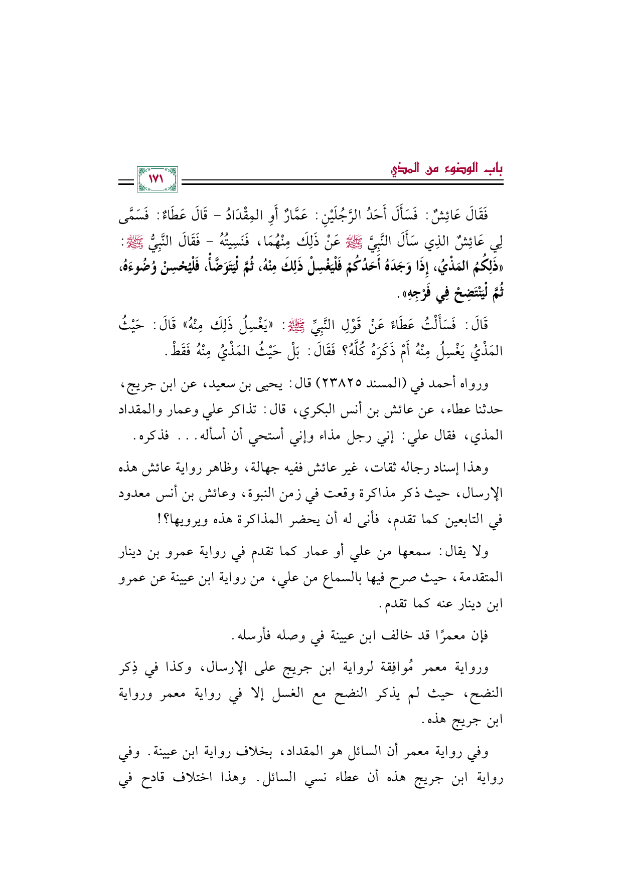 ورواه أحمد في (المسند ٢٣٨٢٥) قال: يحيى بن سعيد، عن ابن جريج، حدثنا عطاء، عن عائش بن أنس البكري، قال: تذاكر علي وعمار والمقداد المذي، فقال علي: إني رجل مذاء وإني أستحي أن أسأله ... فذكره.