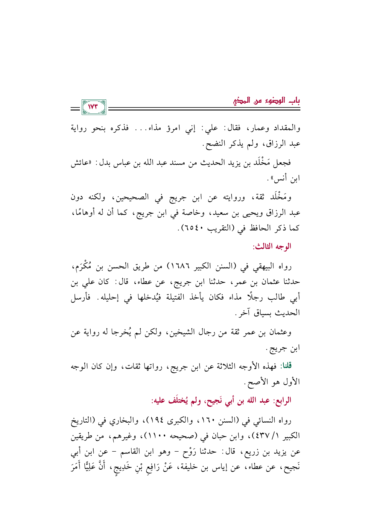 والمقداد وعمار، فقال: علي: إني امرؤ مذاء ... فذكره بنحو رواية عبد الرزاق، ولم يذكر النضح.