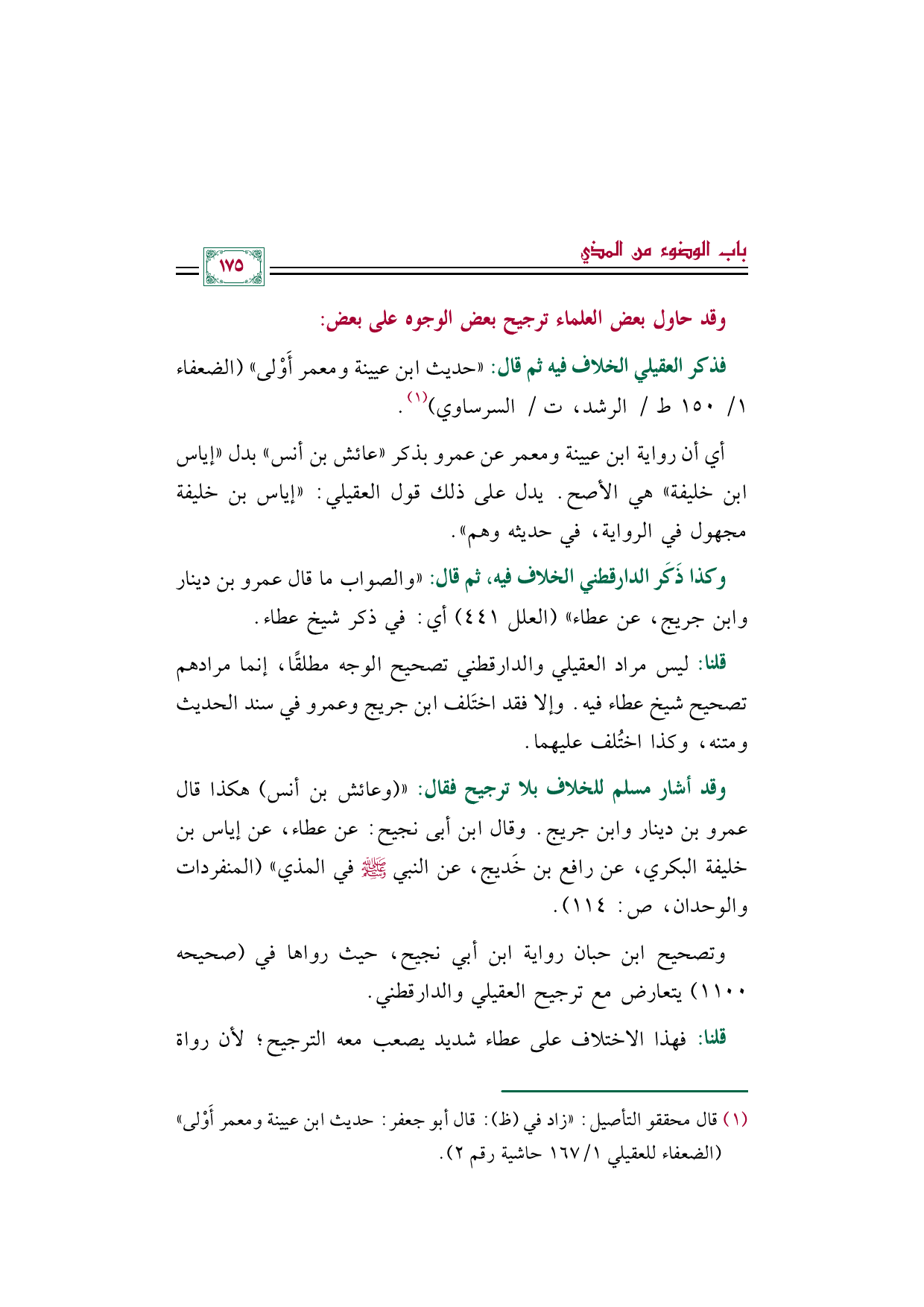 فذكر العقيلي الخلاف فيه ثم قال: ((حديث ابن عيينة ومعمر أَوْلى)) (الضعفاء ١/ ١٥٠ ط/ الرشد، ت/ السرساوي) (¬١).