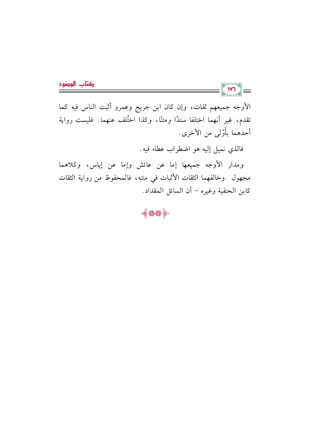الأوجه جميعهم ثقات، وإن كان ابن جريج وعمرو أثبت الناس فيه كما تقدم، غير أنهما اختلفا سندًا ومتنًا، وكذا اختُلف عنهما. فليست رواية أحدهما بأَوْلى من الأخرى.