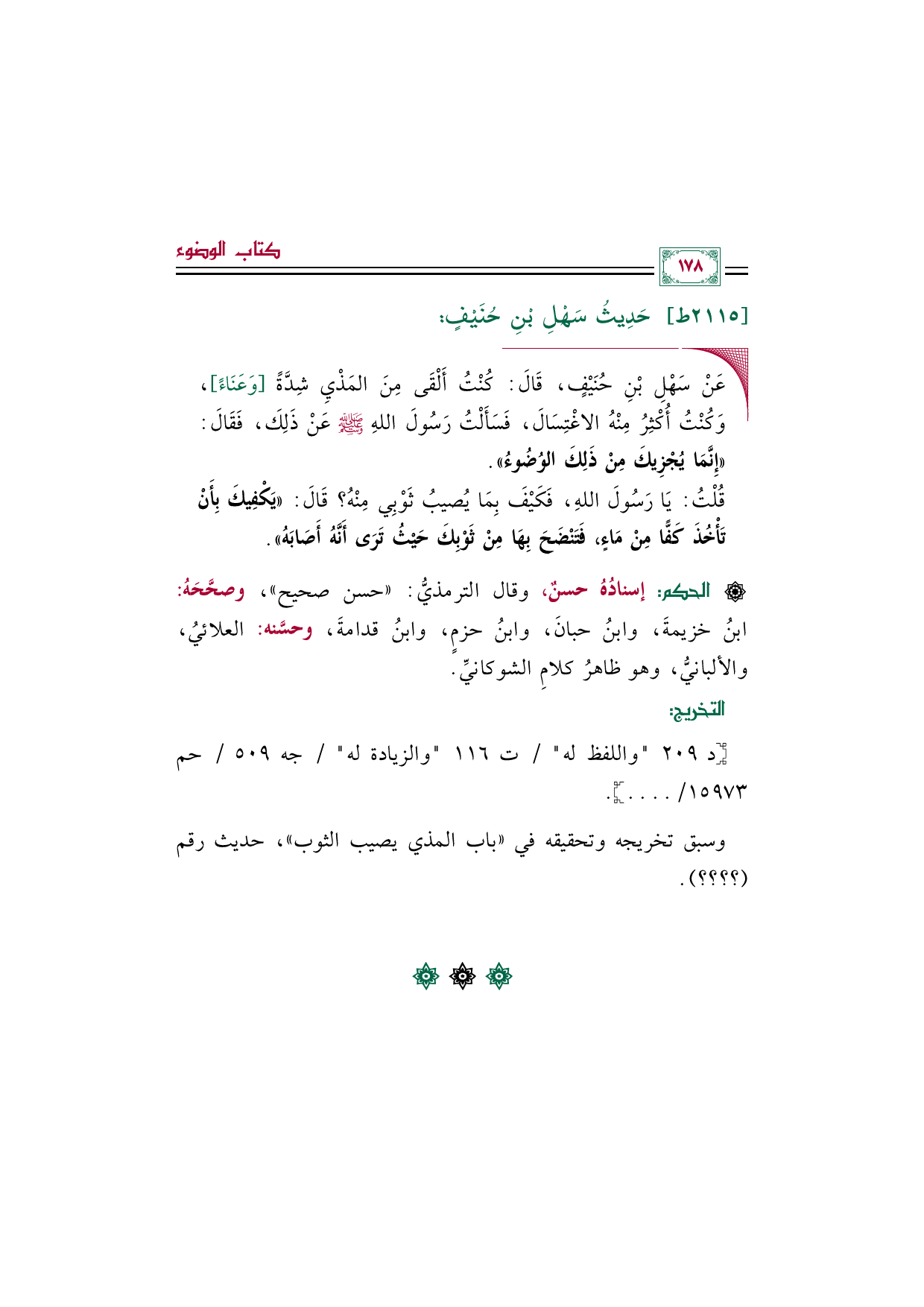 ◼ عَنْ سَهْلِ بْنِ حُنَيْفٍ، قَالَ: كُنْتُ أَلْقَى مِنَ المَذْيِ شِدَّةً [وَعَنَاءً]، وَكُنْتُ أُكْثِرُ مِنْهُ الاغْتِسَالَ، فَسَأَلْتُ رَسُولَ اللهِ صَلَّى اللهُ عَلَيْهِ وَسَلَّمَ عَنْ ذَلِكَ، فَقَالَ: ((إِنَّمَا يُجْزِيكَ مِنْ ذَلِكَ الوُضُوءُ)).