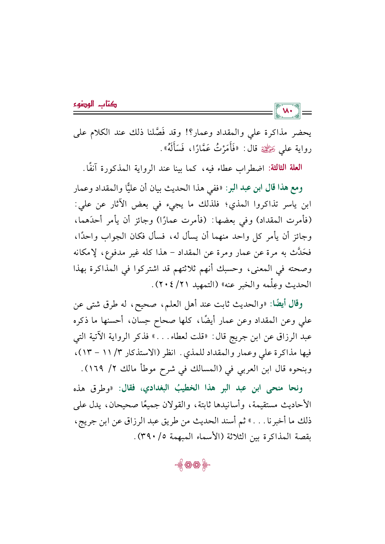 وقال أيضًا: "والحديث ثابت عند أهل العلم، صحيح، له طرق شتى عن علي وعن المقداد وعن عمار أيضًا، كلها صحاح حِسان، أحسنها ما ذكره عبد الرزاق عن ابن جريج قال: "قلت لعطاء ... " فذكر الرواية الآتية التي فيها مذاكرة علي وعمار والمقداد للمذي. انظر (الاستذكار ٣/ ١١ - ١٣)، وبنحوه قال ابن العربي في (المسالك في شرح موطأ مالك ٢/ ١٦٩).