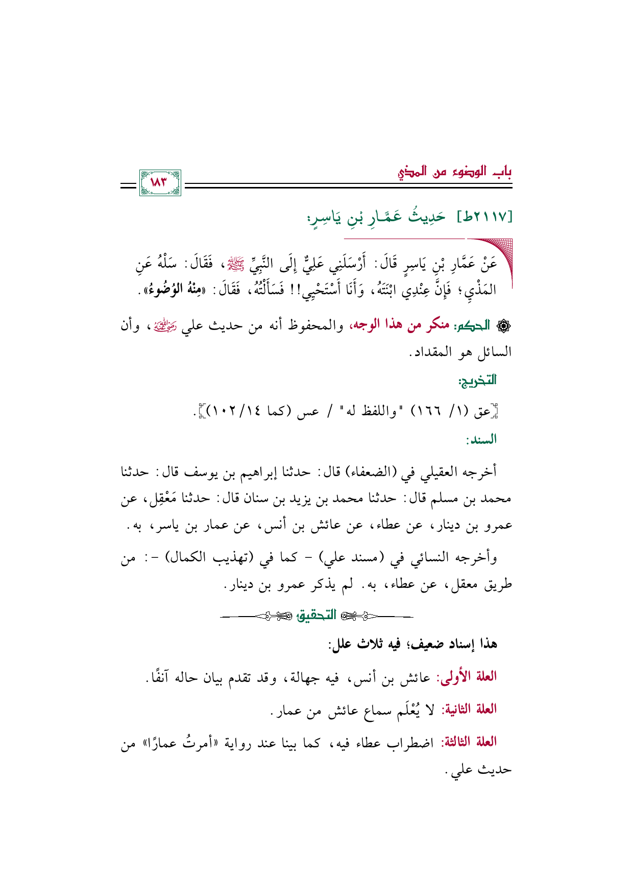 أخرجه العقيلي في (الضعفاء) قال: حدثنا إبراهيم بن يوسف قال: حدثنا محمد بن مسلم قال: حدثنا محمد بن يزيد بن سنان قال: حدثنا مَعْقِل، عن عمرو بن دينار، عن عطاء، عن عائش بن أنس، عن عمار بن ياسر، به.