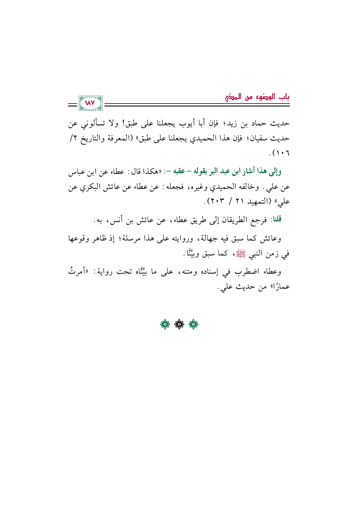 وإلى هذا أشار ابن عبد البر بقوله - عقبه -: " هكذا قال: عطاء عن ابن عباس عن علي. وخالفه الحميدي وغيره، فجعله: عن عطاء عن عائش البكري عن علي" (التمهيد ٢١/ ٢٠٣).