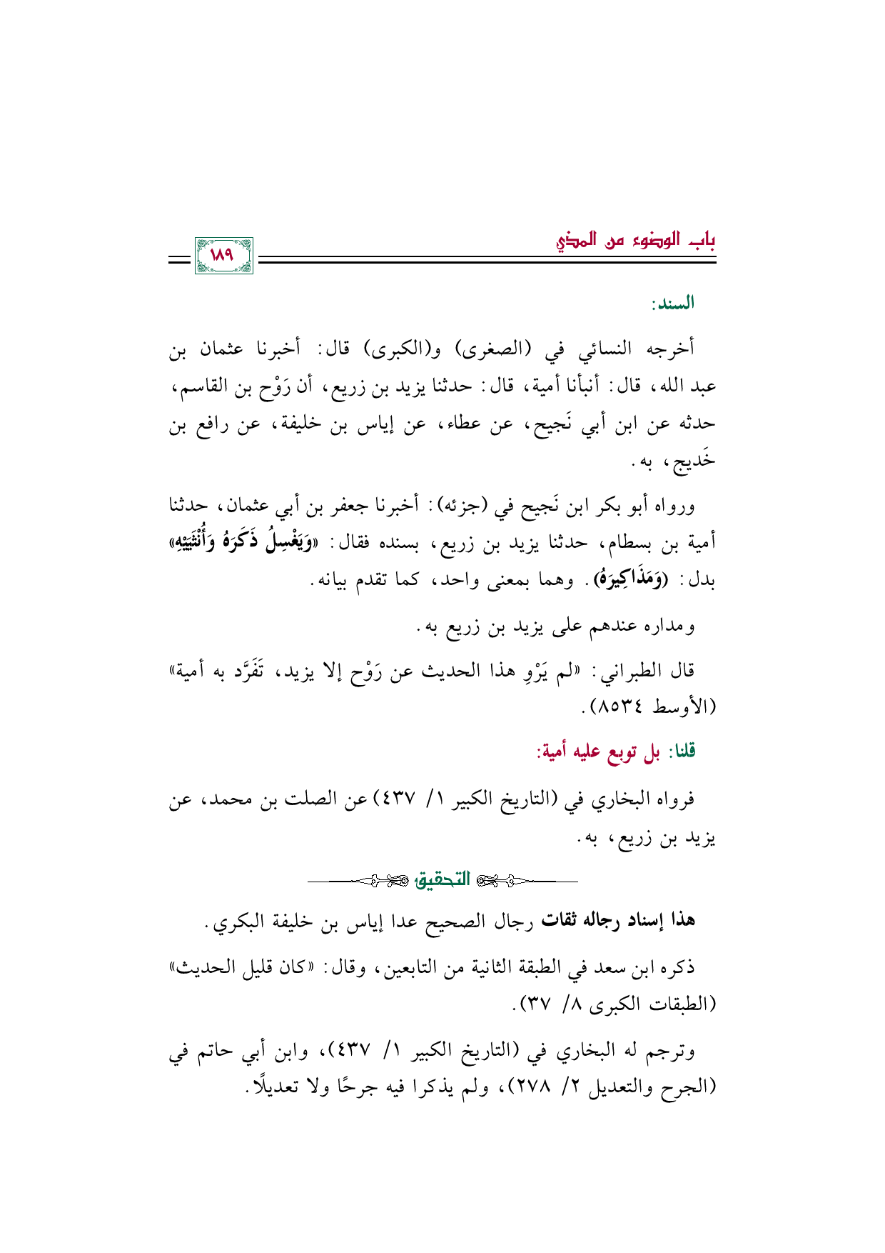 ورواه أبو بكر ابن نَجيح في (جزئه): أخبرنا جعفر بن أبي عثمان، حدثنا أمية بن بسطام، حدثنا يزيد بن زريع، بسنده فقال: ((وَيَغْسِلُ ذَكَرَهُ وَأُنْثَيَيْهِ)) بدل: (وَمَذَاكِيرَهُ). وهما بمعنى واحد، كما تقدم بيانه.