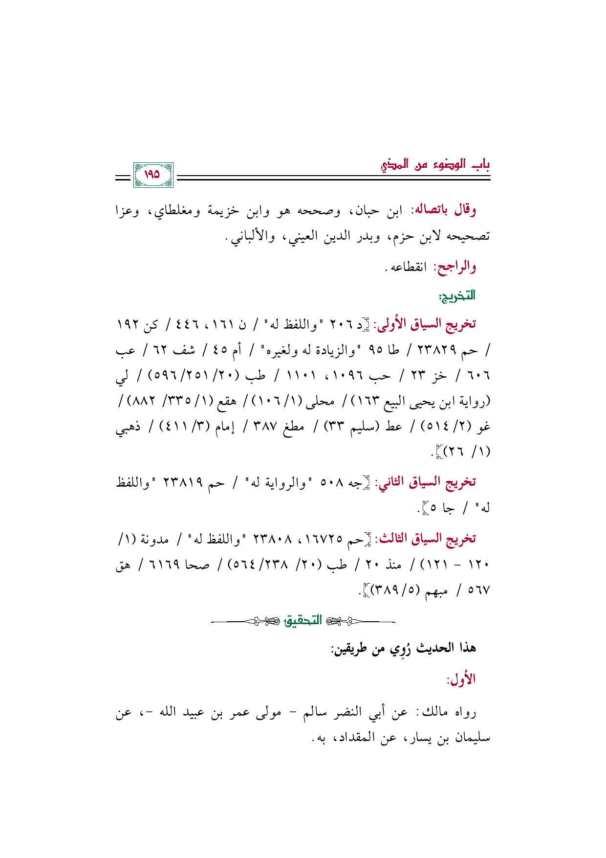 تخريج السياق الأولى: [د ٢٠٦ "واللفظ له" / ن ١٦١، ٤٤٦ / كن ١٩٢/ حم ٢٣٨٢٩/ طا ٩٥ "والزيادة له ولغيره" / أم ٤٥/ شف ٦٢/ عب ٦٠٦/ خز ٢٣ / حب ١٠٩٦، ١١٠١ / طب (٢٠/ ٢٥١/٥٩٦) / لي (رواية ابن يحيى البيع ١٦٣) / محلى (١/ ١٠٦) / هقع (١/ ٣٣٥/ ٨٨٢) / غو (٢/ ٥١٤) / عط (سليم ٣٣) / مطغ ٣٨٧ / إمام (٣/ ٤١١) / ذهبي (١/ ٢٦)].