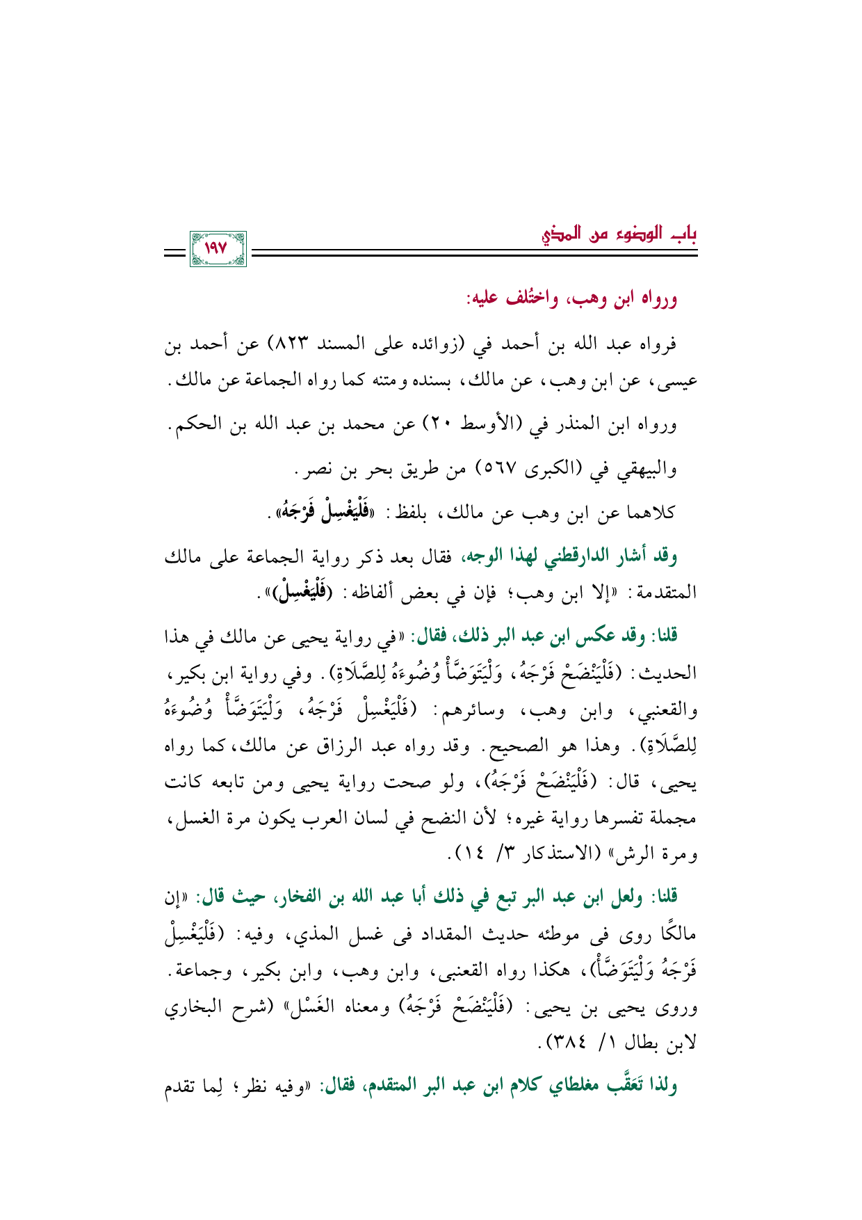 قلنا: وقد عكس ابن عبد البر ذلك، فقال: ((في رواية يحيى عن مالك في هذا الحديث: (فَلْيَنْضَحْ فَرْجَهُ، وَلْيَتَوَضَّأْ وُضُوءَهُ لِلصَّلَاةِ). وفي رواية ابن بكير، والقعنبي، وابن وهب، وسائرهم: (فَلْيَغْسِلْ فَرْجَهُ، وَلْيَتَوَضَّأْ وُضُوءَهُ لِلصَّلَاةِ). وهذا هو الصحيح. وقد رواه عبد الرزاق عن مالك، كما رواه يحيى، قال: (فَلْيَنْضَحْ فَرْجَهُ)، ولو صحت رواية يحيى ومن تابعه كانت مجملة تفسرها رواية غيره؛ لأن النضح في لسان العرب يكون مرة الغسل، ومرة الرش)) (الاستذكار ٣/ ١٤).