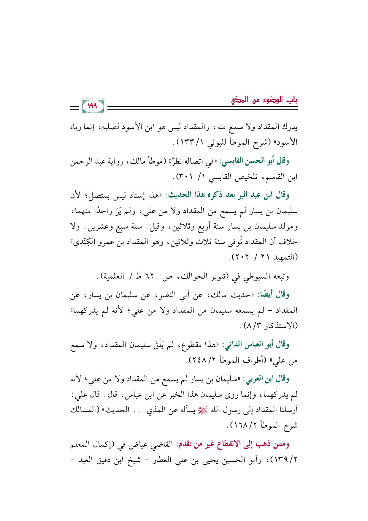 وقال ابن العربي: ((سليمان بن يسار لم يسمع من المقداد ولا من علي؛ لأنه لم يدركهما، وإنما روى سليمان هذا الخبر عن ابن عباس، قال: قال علي: أرسلنا المقداد إلى رسول الله صلى الله عليه وسلم يسأله عن المذي ... الحديث)) (المسالك شرح الموطأ ٢/ ١٦٨).