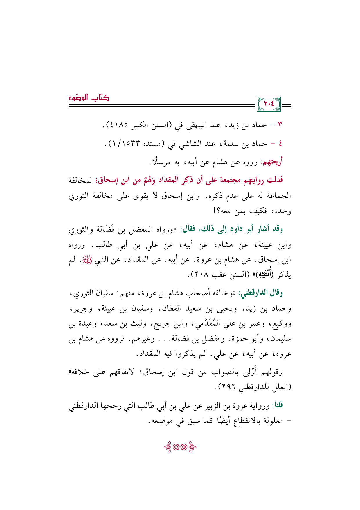 وقال الدارقطني: "وخالفه أصحاب هشام بن عروة، منهم: سفيان الثوري، وحماد بن زيد، ويحيى بن سعيد القطان، وسفيان بن عيينة، وجرير، ووكيع، وعمر بن علي المُقَدَّمي، وابن جريج، وليث بن سعد، وعبدة بن سليمان، وأبو حمزة، ومفضل بن فضالة ... وغيرهم، فرووه عن هشام بن عروة، عن أبيه، عن علي. لم يذكروا فيه المقداد.