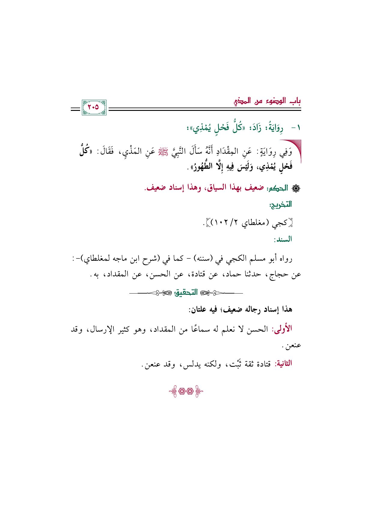 رواه أبو مسلم الكجي في (سننه) - كما في (شرح ابن ماجه لمغلطاي) -: عن حجاج، حدثنا حماد، عن قتادة، عن الحسن، عن المقداد، به.