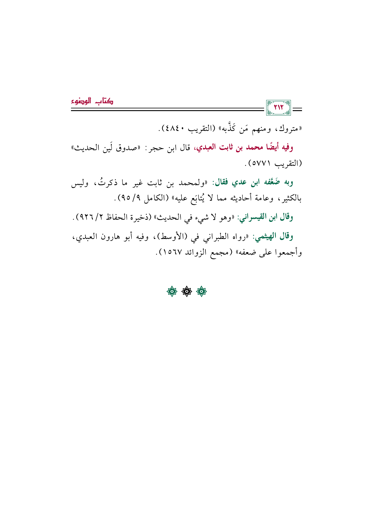 وبه ضَعَّفه ابن عدي فقال: ((ولمحمد بن ثابت غير ما ذكرتُ، وليس بالكثير، وعامة أحاديثه مما لا يُتابَع عليه)) (الكامل ٩/ ٩٥).