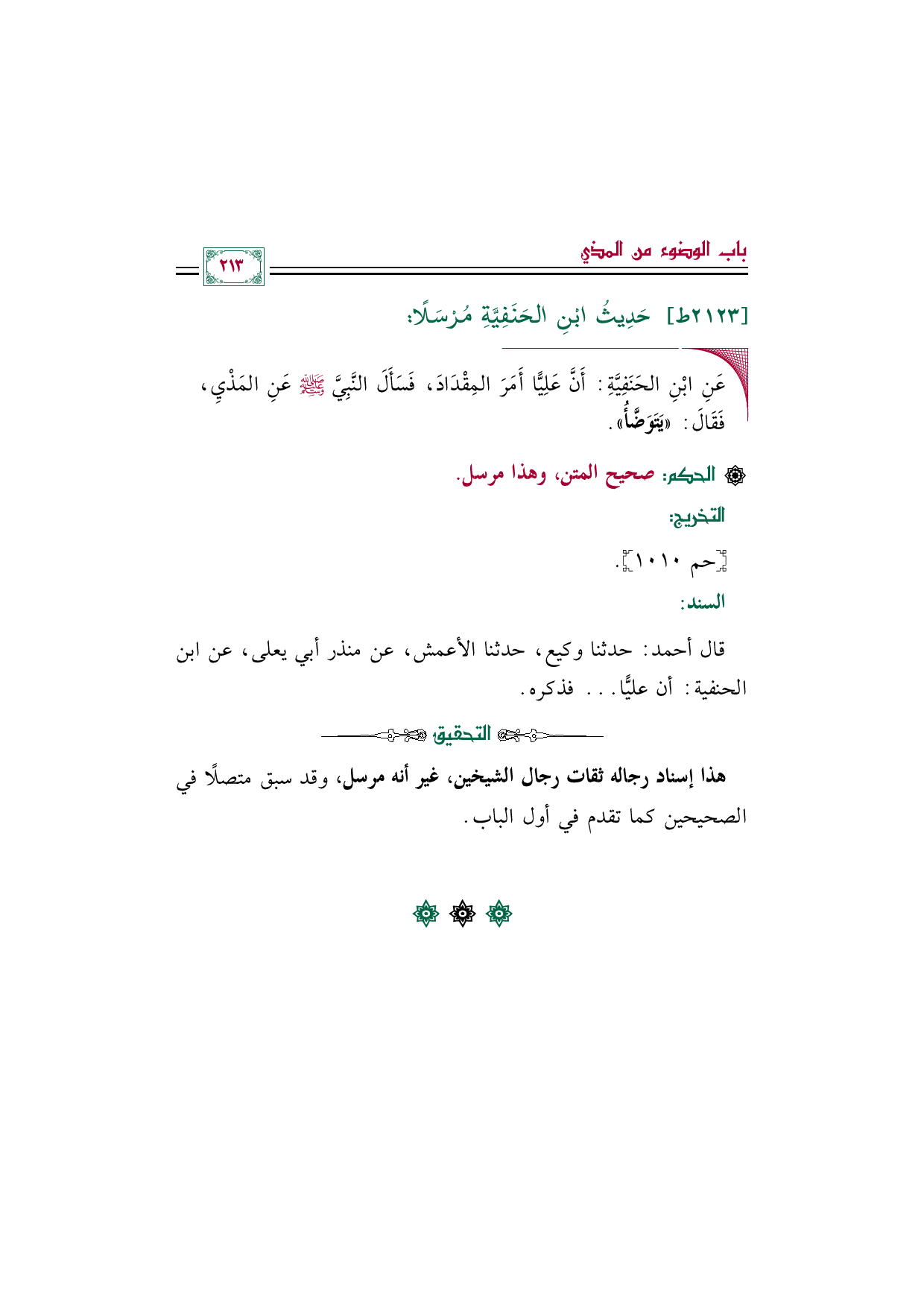 ◼ عَنِ ابْنِ الحَنَفِيَّةِ: أَنَّ عَلِيًّا أَمَرَ المِقْدَادَ، فَسَأَلَ النَّبِيَّ صَلَّى اللهُ عَلَيْهِ وَسَلَّمَ عَنِ المَذْيِ، فَقَالَ: ((يَتَوَضَّأُ)).
