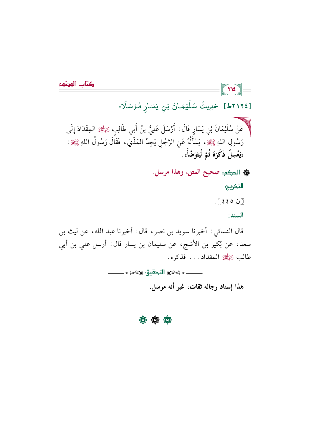 ◼ عَنْ سُلَيْمَانَ بْنِ يَسَارٍ قَالَ: أَرْسَلَ عَلِيُّ بنُ أَبي طَالِبٍ رَضِيَ اللهُ عَنهُ المِقْدَادَ إِلَى رَسُولِ اللهِ صَلَّى اللهُ عَليْهِ وَسَلَّمَ، يَسْأَلُهُ عَنِ الرَّجُلِ يَجِدُ المَذْيَ، فَقَالَ رَسُولُ اللهِ صَلَّى اللهُ عَليْهِ وَسَلَّمَ: ((يَغْسِلُ ذَكَرَهُ ثُمَّ لْيَتَوَضَّأْ)).