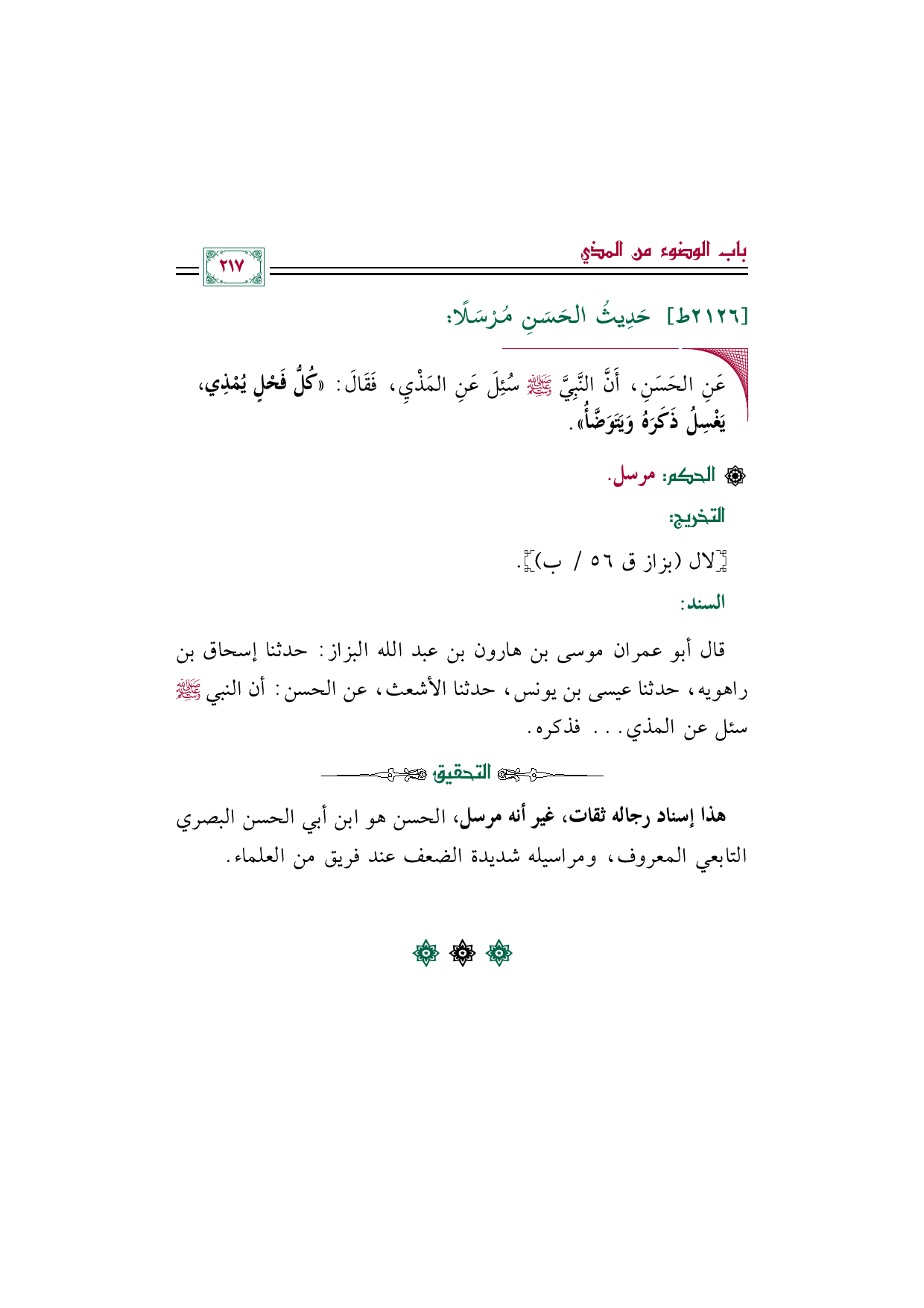 قال أبو عمران موسى بن هارون بن عبد الله البزاز: حدثنا إسحاق بن راهويه، حدثنا عيسى بن يونس، حدثنا الأشعث، عن الحسن: أن النبي صلى الله عليه وسلم سئل عن المذي ... فذكره.
