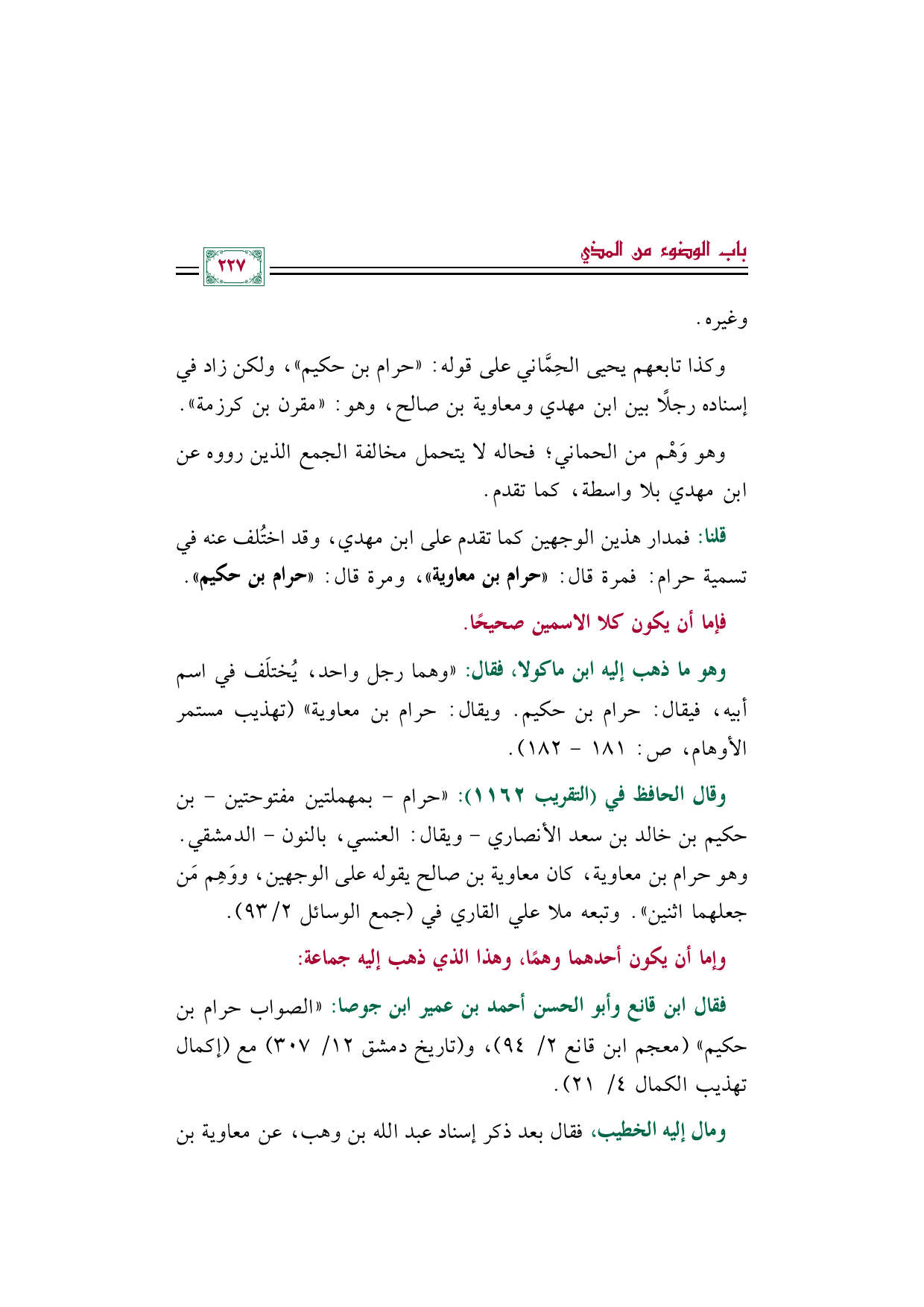وقال الحافظ في (التقريب ١١٦٢): ((حرام -بمهملتين مفتوحتين- بن حكيم بن خالد بن سعد الأنصاري -ويقال: العنسي، بالنون- الدمشقي. وهو حرام بن معاوية، كان معاوية بن صالح يقوله على الوجهين، ووَهِم مَن جعلهما اثنين)). وتبعه ملا علي القاري في (جمع الوسائل ٢/ ٩٣).