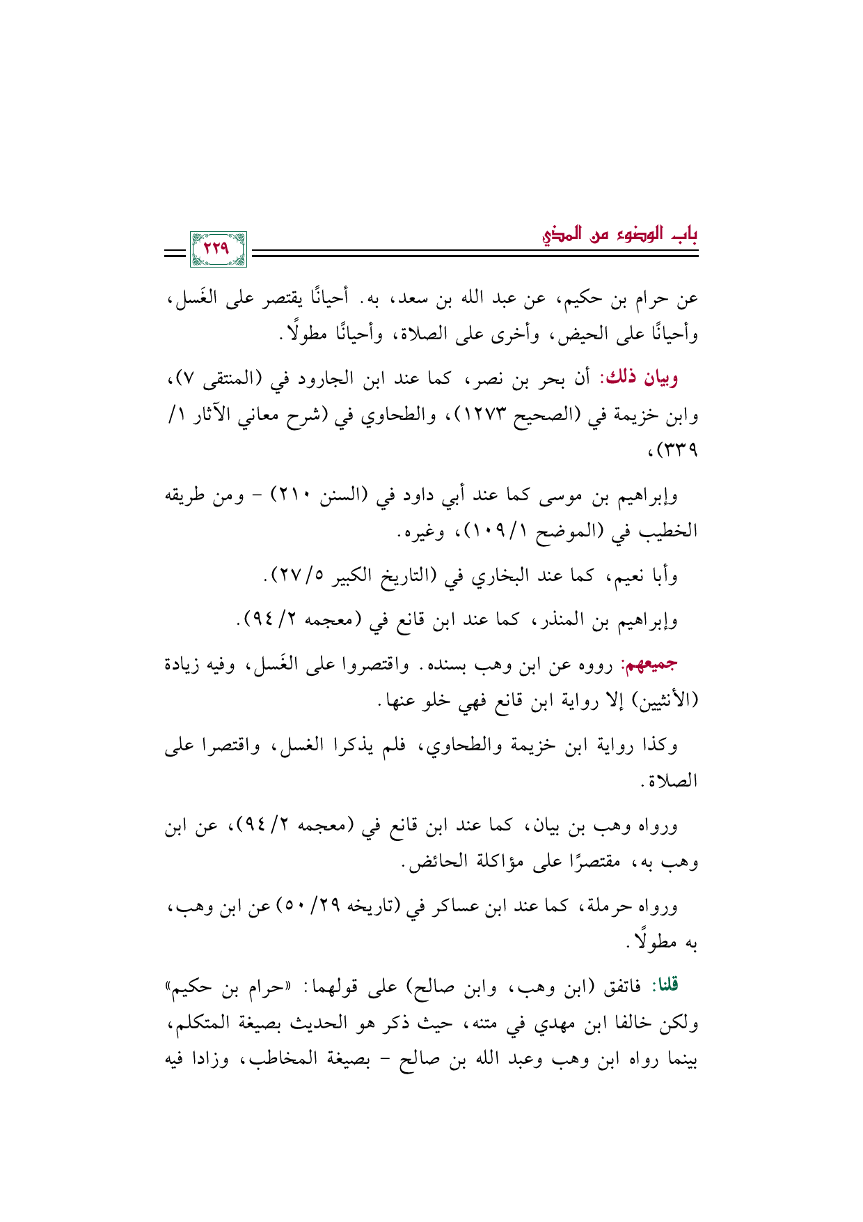 عن حرام بن حكيم، عن عبد الله بن سعد، به. أحيانًا يقتصر على الغَسل، وأحيانًا على الحيض، وأخرى على الصلاة، وأحيانًا مطولًا.