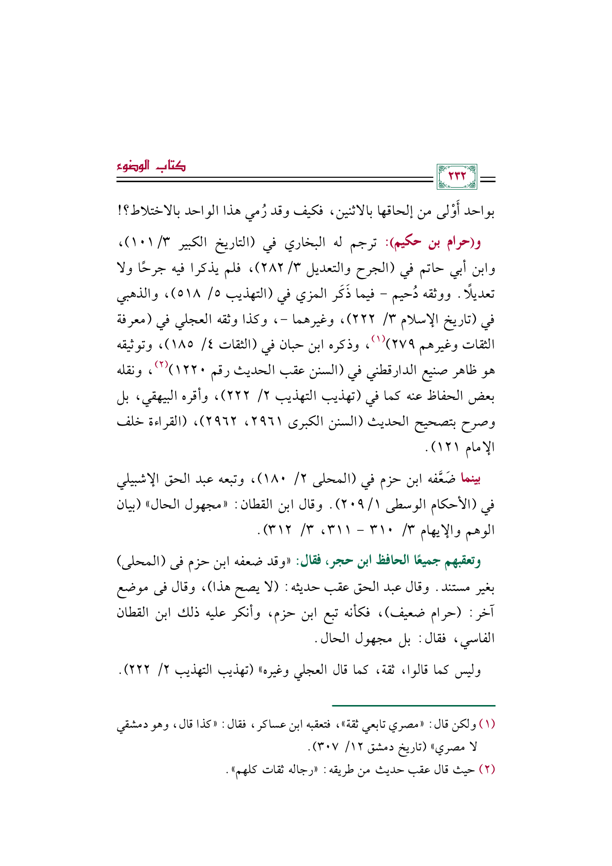 بينما ضَعَّفه ابن حزم في (المحلى ٢/ ١٨٠)، وتبعه عبد الحق الإشبيلي في (الأحكام الوسطى ١/ ٢٠٩). وقال ابن القطان: ((مجهول الحال)) (بيان الوهم والإيهام ٣/ ٣١٠ - ٣١١، ٣/ ٣١٢).