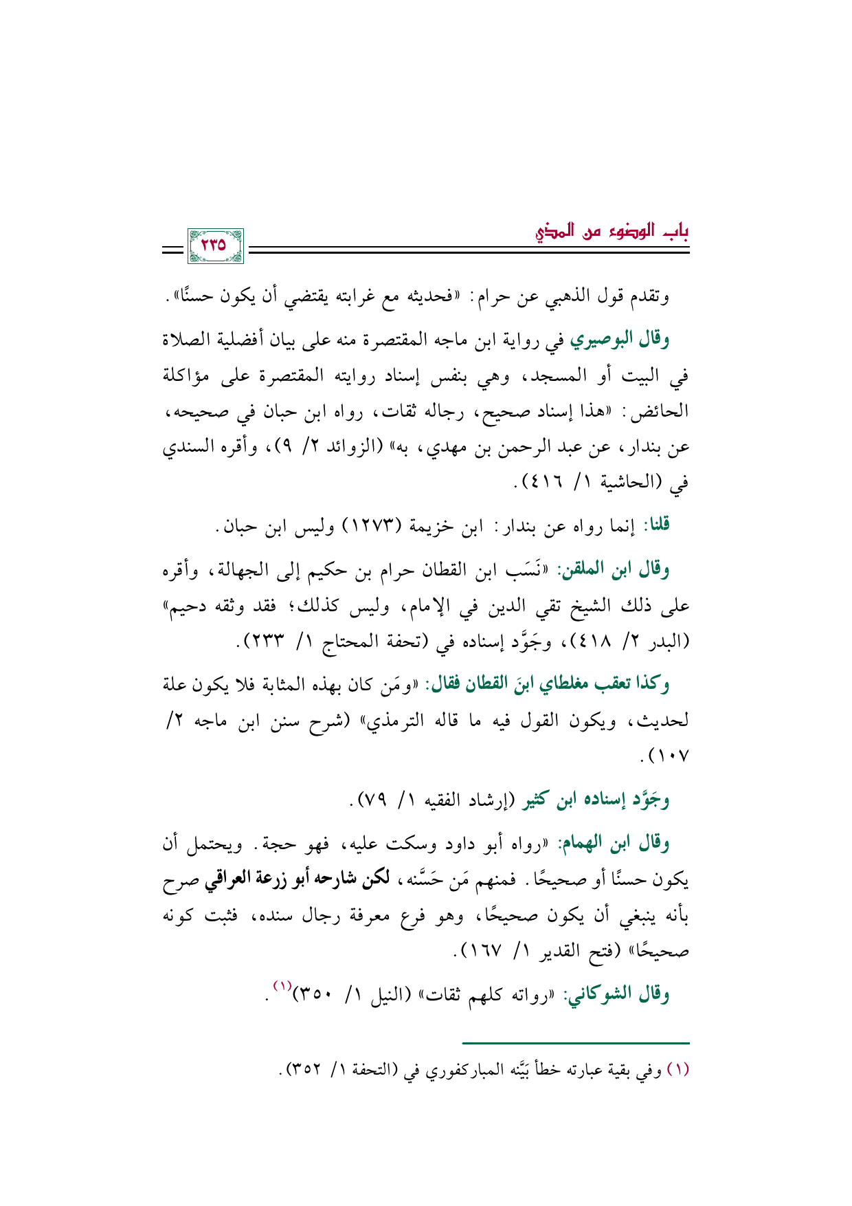 وقال ابن الملقن: ((نَسَب ابن القطان حرام بن حكيم إلى الجهالة، وأقره على ذلك الشيخ تقي الدين في الإمام، وليس كذلك؛ فقد وثقه دحيم)) (البدر ٢/ ٤١٨)، وجَوَّد إسناده في (تحفة المحتاج ١/ ٢٣٣).