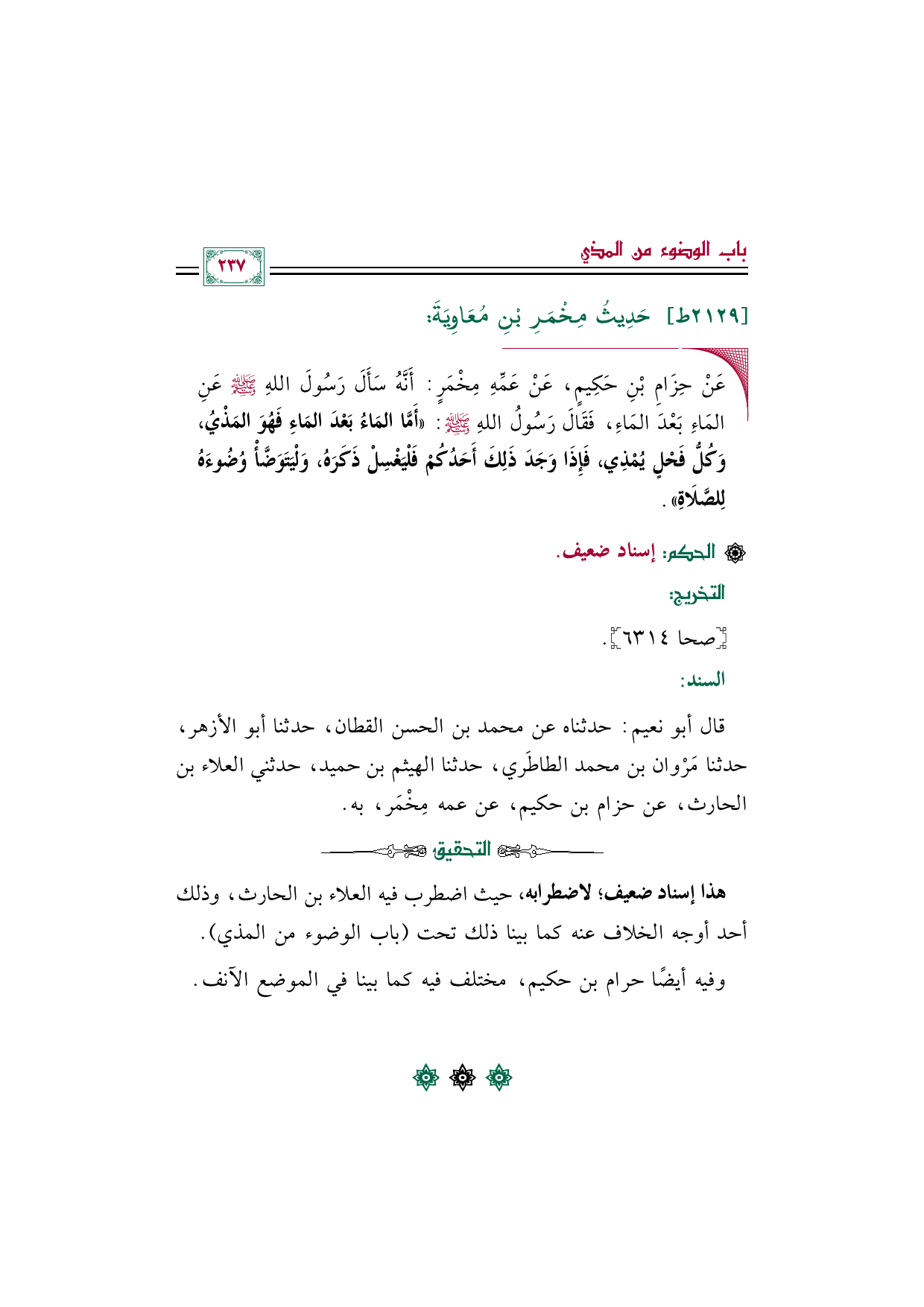 هذا إسناد ضعيف؛ لاضطرابه، حيث اضطرب فيه العلاء بن الحارث، وذلك أحد أوجه الخلاف عنه كما بينا ذلك تحت (باب الوضوء من المذي).