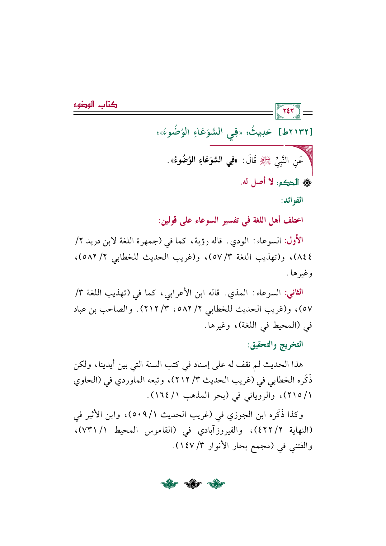 الثاني: السوعاء: المذي. قاله ابن الأعرابي، كما في (تهذيب اللغة ٣/ ٥٧)، و (غريب الحديث للخطابي ٢/ ٥٨٢، ٣/ ٢١٢). والصاحب بن عباد في (المحيط في اللغة)، وغيرها.