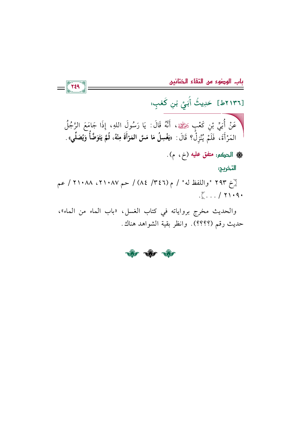 ◼ عَنْ أُبَيِّ بْنِ كَعْبٍ رَضِيَ اللهُ عَنْهُ، أَنَّهُ قَالَ: يَا رَسُولَ اللهِ، إِذَا جَامَعَ الرَّجُلُ المَرْأَةَ، فَلَمْ يُنْزِلْ؟ قَالَ: «يَغْسِلُ مَا مَسَّ المَرْأَةَ مِنْهُ، ثُمَّ يَتَوَضَّأُ وَيُصَلِّي».