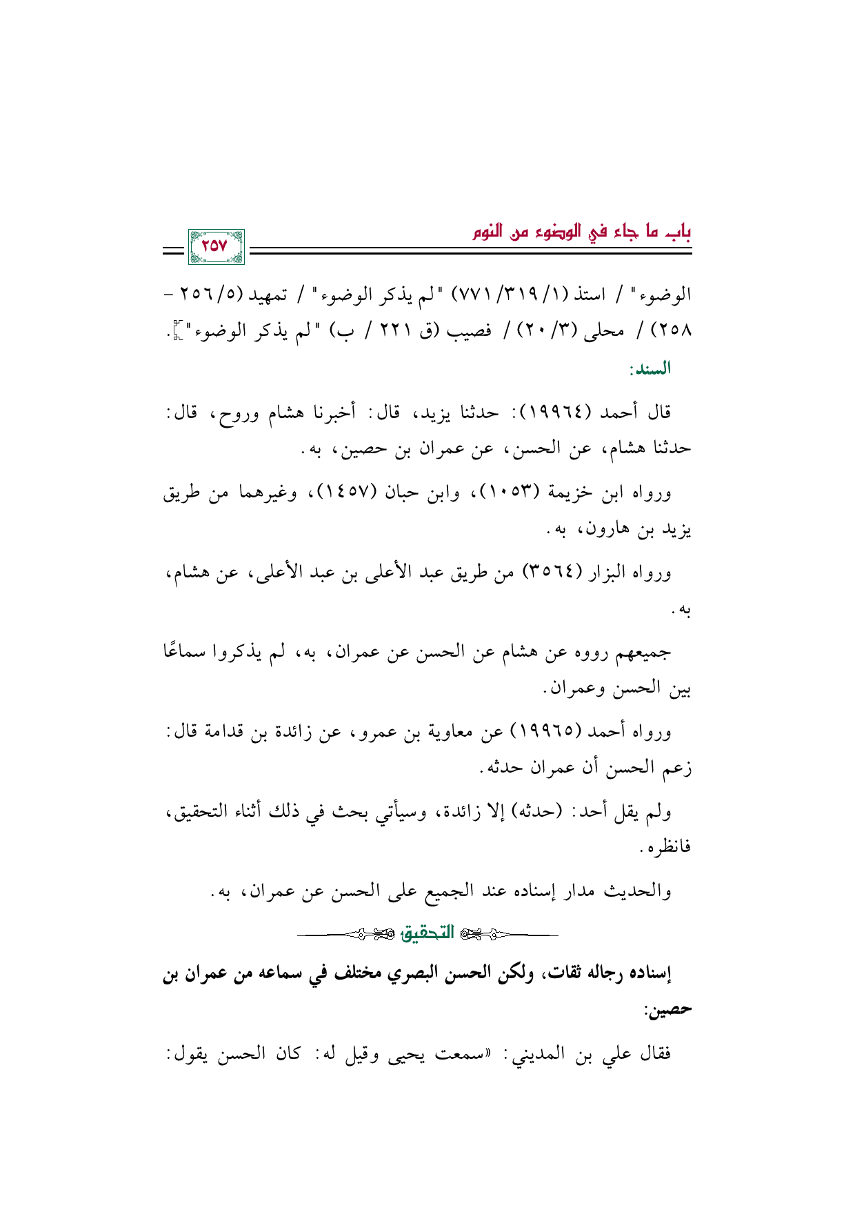 قال أحمد (١٩٩٦٤): حدثنا يزيد، قال: أخبرنا هشام وروح، قال: حدثنا هشام، عن الحسن، عن عمران بن حصين، به.