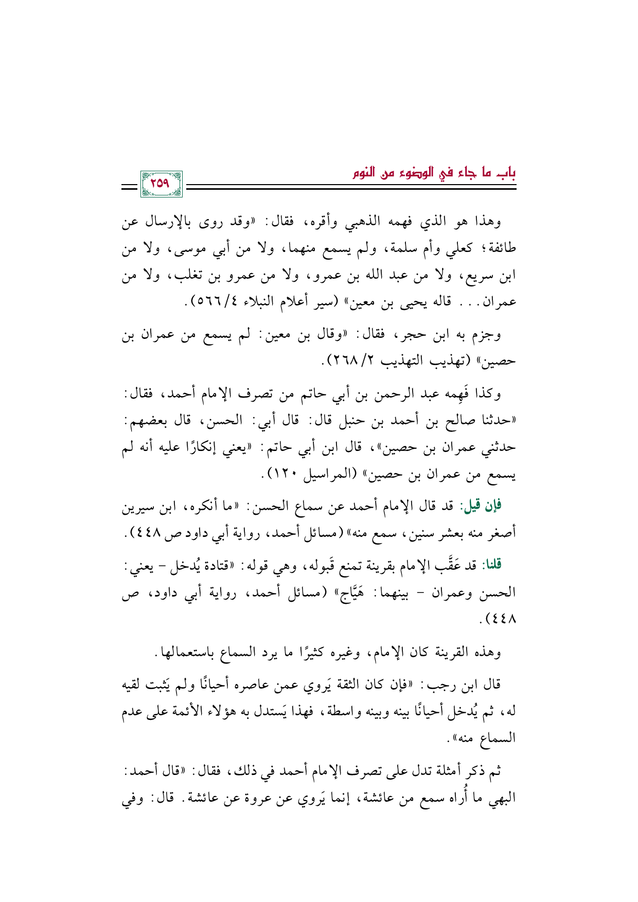 وكذا فَهِمه عبد الرحمن بن أبي حاتم من تصرف الإمام أحمد، فقال: ((حدثنا صالح بن أحمد بن حنبل قال: قال أبي: الحسن، قال بعضهم: حدثني عمران بن حصين))، قال ابن أبي حاتم: ((يعني إنكارًا عليه أنه لم يسمع من عمران بن حصين)) (المراسيل ١٢٠).