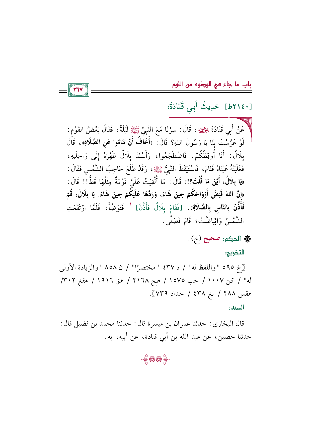 ◼ عَنْ أَبِي قَتَادَةَ رضي الله عنه، قَالَ: سِرْنَا مَعَ النَّبِيِّ صَلَّى اللهُ عَلَيْهِ وَسَلَّمَ لَيْلَةً، فَقَالَ بَعْضُ القَوْمِ: لَوْ عَرَّسْتَ بِنَا يَا رَسُولَ اللهِ؟ قَالَ: ((أَخَافُ أَنْ تَنَامُوا عَنِ الصَّلَاةِ))، قَالَ بِلَالٌ: أَنَا أُوقِظُكُمْ. فَاضْطَجَعُوا، وَأَسْنَدَ بِلَالٌ ظَهْرَهُ إِلَى رَاحِلَتِهِ، فَغَلَبَتْهُ عَيْنَاهُ فَنَامَ، فَاسْتَيْقَظَ النَّبِيُّ صَلَّى اللهُ عَلَيْهِ وَسَلَّمَ، وَقَدْ طَلَعَ حَاجِبُ الشَّمْسِ فَقَالَ: ((يَا بِلَالُ، أَيْنَ مَا قُلْتَ؟ ! )) قَالَ: مَا أُلْقِيَتْ عَلَيَّ نَوْمَةٌ مِثْلُهَا قَطُّ! ! قَالَ: ((إِنَّ اللهَ قَبَضَ أَرْوَاحَكُمْ حِينَ شَاءَ، وَرَدَّهَا عَلَيْكُمْ حِينَ شَاءَ. يَا بِلَالُ، قُمْ فَأَذِّنْ بِالنَّاسِ بِالصَّلَاةِ)). [فَقَامَ بِلَالٌ فَأَذَّنَ] ١ فَتَوَضَّأَ، فَلَمَّا ارْتَفَعَتِ الشَّمْسُ وَابْيَاضَّتْ؛ قَامَ فَصَلَّى.