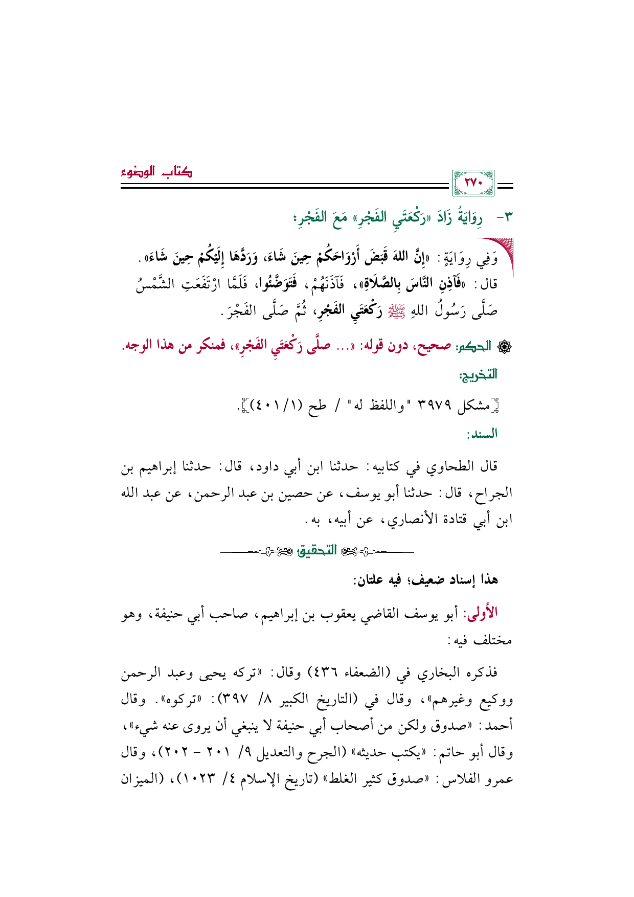 قال الطحاوي في كتابيه: حدثنا ابن أبي داود، قال: حدثنا إبراهيم بن الجراح، قال: حدثنا أبو يوسف، عن حصين بن عبد الرحمن، عن عبد الله بن أبي قتادة الأنصاري، عن أبيه، به.