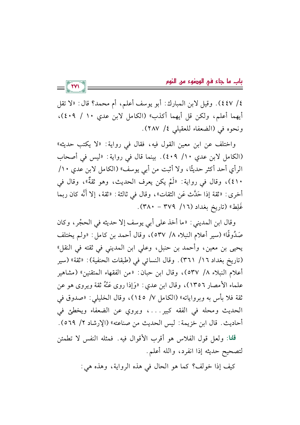 ٤/ ٤٤٧). وقيل لابن المبارك: أبو يوسف أعلم، أم محمد؟ قال: "لا تقل أيهما أعلم، ولكن قل أيهما أكذب" (الكامل لابن عدي ١٠/ ٤٠٩)، ونحوه في (الضعفاء للعقيلي ٤/ ٢٨٧).