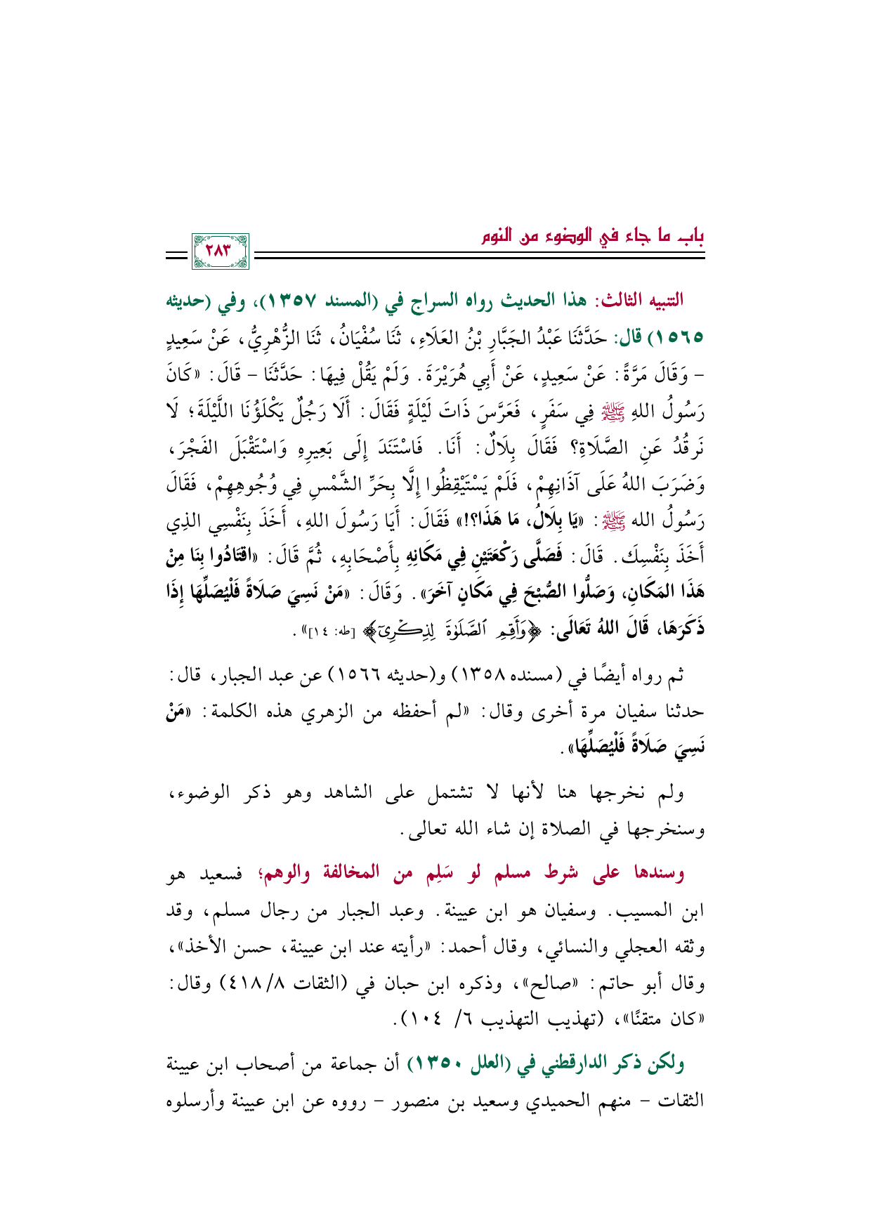 التنبيه الثالث: هذا الحديث رواه السراج في (المسند ١٣٥٧)، وفي (حديثه ١٥٦٥) قال: حَدَّثَنَا عَبْدُ الجَبَّارِ بْنُ العَلَاءِ، ثَنَا سُفْيَانُ، ثَنَا الزُّهْرِيُّ، عَنْ سَعِيدٍ- وَقَالَ مَرَّةً: عَنْ سَعِيدٍ، عَنْ أَبِي هُرَيْرَةَ. وَلَمْ يَقُلْ فِيهَا: حَدَّثَنَا- قَالَ: "كَانَ رَسُولُ اللهِ صَلَّى اللهُ عَلَيْهِ وَسَلَّمَ فِي سَفَرٍ، فَعَرَّسَ ذَاتَ لَيْلَةٍ فَقَالَ: أَلَا رَجُلٌ يَكْلَؤُنَا اللَّيْلَةَ؛ لَا نَرقُدُ عَنِ الصَّلَاةِ؟ فَقَالَ بِلَالٌ: أَنَا. فَاسْتَنَدَ إِلَى بَعِيرِهِ وَاسْتَقْبَلَ الفَجْرَ، وَضَرَبَ اللهُ عَلَى آذَانِهِمْ، فَلَمْ يَسْتَيْقِظُوا إِلَّا بِحَرِّ الشَّمْسِ فِي وُجُوهِهِمْ، فَقَالَ رَسُولُ الله صَلَّى اللهُ عَلَيْهِ وَسَلَّمَ: "يَا بِلَالُ، مَا هَذَا؟ ! " فَقَالَ: أَيَا رَسُولَ اللهِ، أَخَذَ بِنَفْسِي الذِي أَخَذَ بِنَفْسِكَ. قَالَ: فَصَلَّى رَكْعَتَيْنِ فِي مَكَانِهِ بِأَصْحَابِهِ، ثُمَّ قَالَ: "اقتَادُوا بِنَا مِنْ هَذَا المَكَانِ، وَصَلُّوا الصُّبْحَ فِي مَكَانٍ آخَرَ". وَقَالَ: "مَنْ نَسِيَ صَلَاةً فَلْيُصَلِّهَا إِذَا ذَكَرَهَا، قَالَ اللهُ تَعَالَى: {أقم الصلاة لذكري} (طه: ١٤) ".