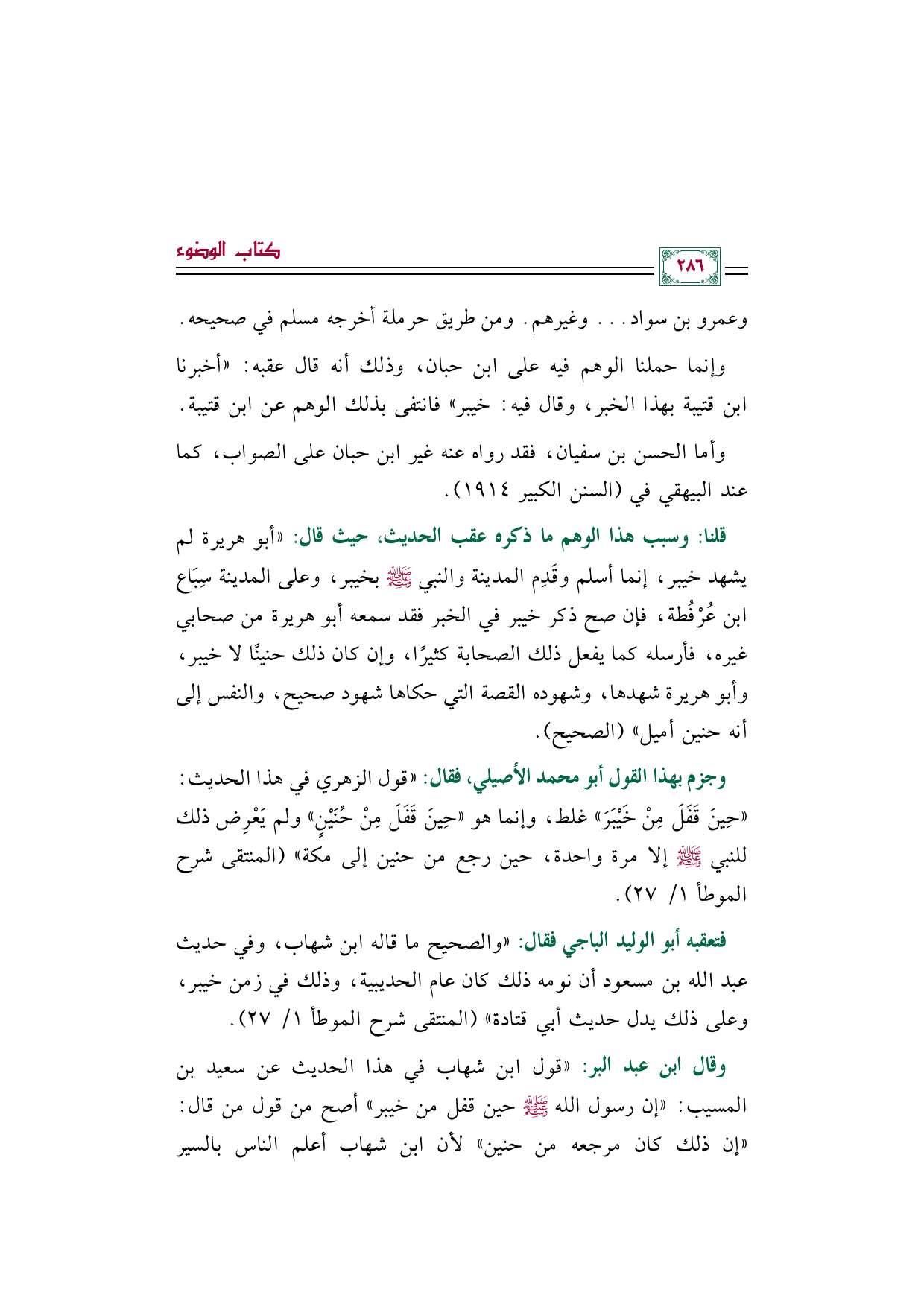 وإنما حملنا الوهم فيه على ابن حبان، وذلك أنه قال عقبه: ((((أخبرنا ابن قتيبة بهذا الخبر، وقال فيه: خيبر)) فانتفى بذلك الوهم عن ابن قتيبة.