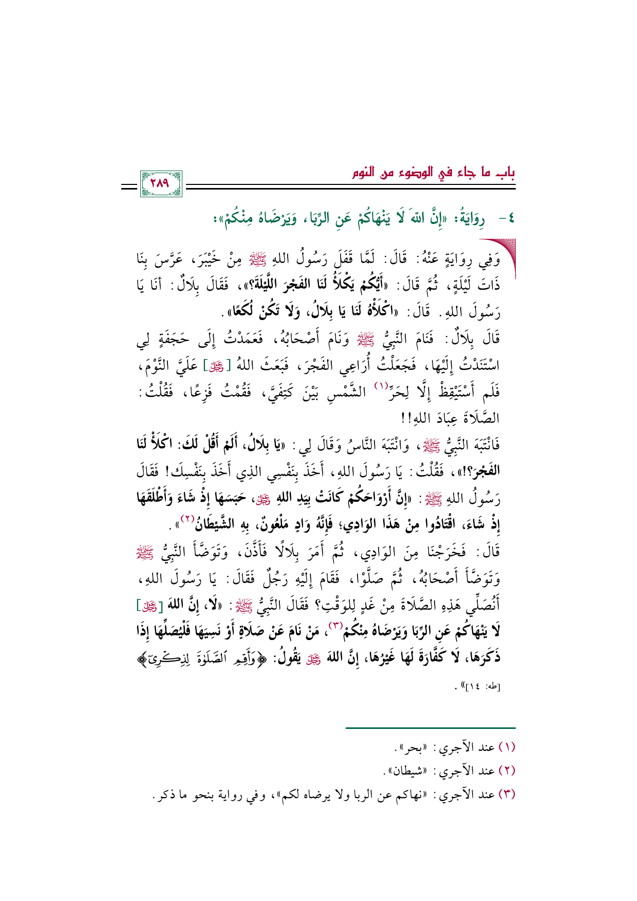 قَالَ: فَخَرَجْنَا مِنَ الوَادِي، ثُمَّ أَمَرَ بِلَالًا فَأَذَّنَ، وَتَوَضَّأَ النَّبِيُّ صَلَّى اللهُ عَلَيْهِ وَسَلَّمَ وَتَوَضَّأَ أَصْحَابُهُ، ثُمَّ صَلَّوْا، فَقَامَ إِلَيْهِ رَجُلٌ فَقَالَ: يَا رَسُولَ اللهِ، أَنُصَلِّي هَذِهِ الصَّلَاةَ مِنْ غَدٍ لِلوَقْتِ؟ فَقَالَ النَّبِيُّ صَلَّى اللهُ عَلَيْهِ وَسَلَّمَ: «لَا، إِنَّ اللهَ [عَزَّ وَجَلَّ] لَا يَنْهَاكُمْ عَنِ الرِّبَا وَيَرْضَاهُ مِنْكُمْ (¬٣)، مَنْ نَامَ عَنْ صَلَاةٍ أَوْ نَسِيَهَا فَلْيُصَلِّهَا إِذَا ذَكَرَهَا، لَا كَفَّارَةَ لَهَا غَيْرُهَا، إِنَّ اللهَ عَزَّ وَجَلَّ يَقُولُ: {وَأَقم الصلاةَ لذكري} [طه: ١٤]».