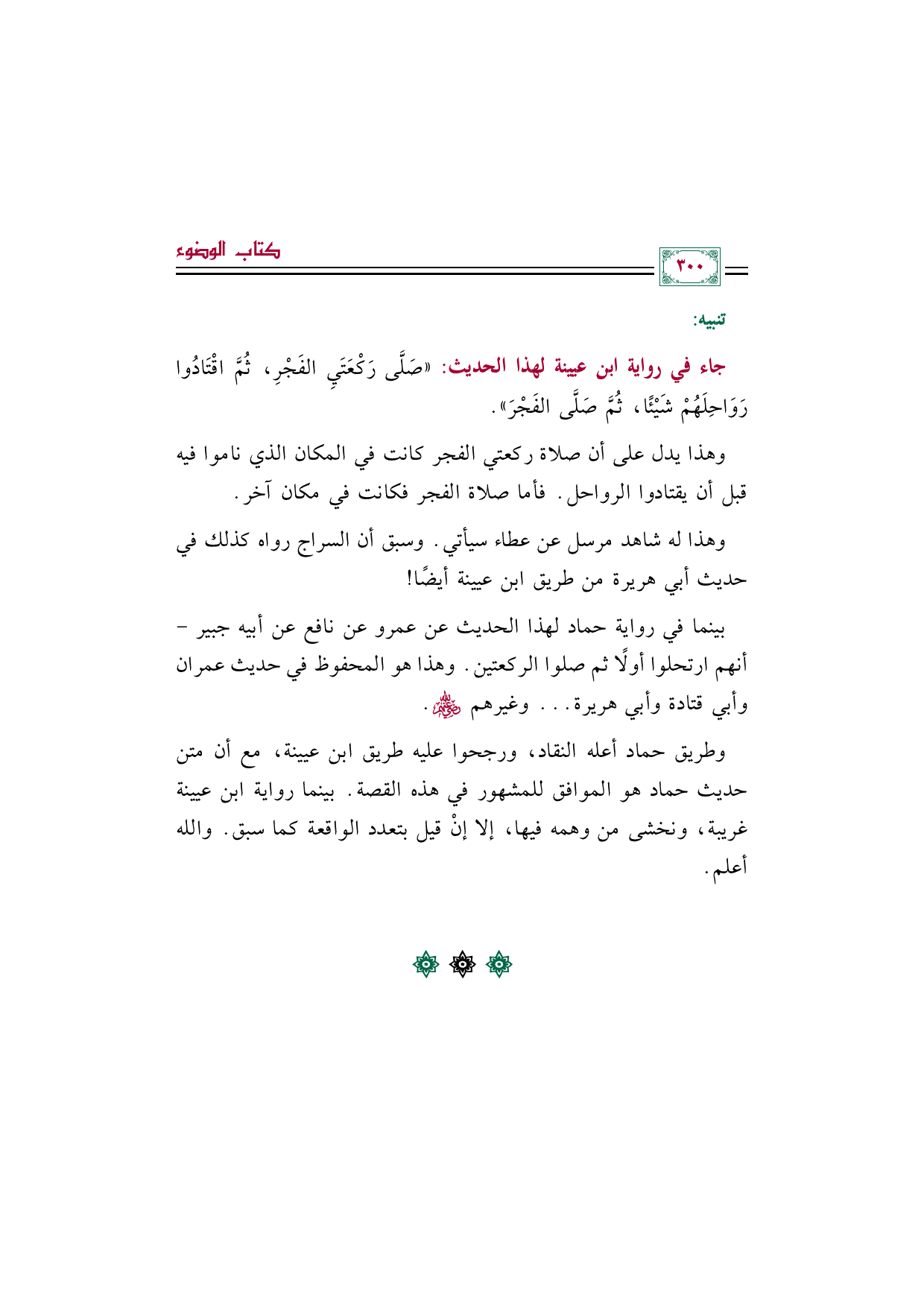 بينما في رواية حماد لهذا الحديث عن عمرو عن نافع عن أبيه جبير- أنهم ارتحلوا أولًا ثم صلوا الركعتين. وهذا هو المحفوظ في حديث عمران وأبي قتادة وأبي هريرة ... وغيرهم رضي الله عنهم.