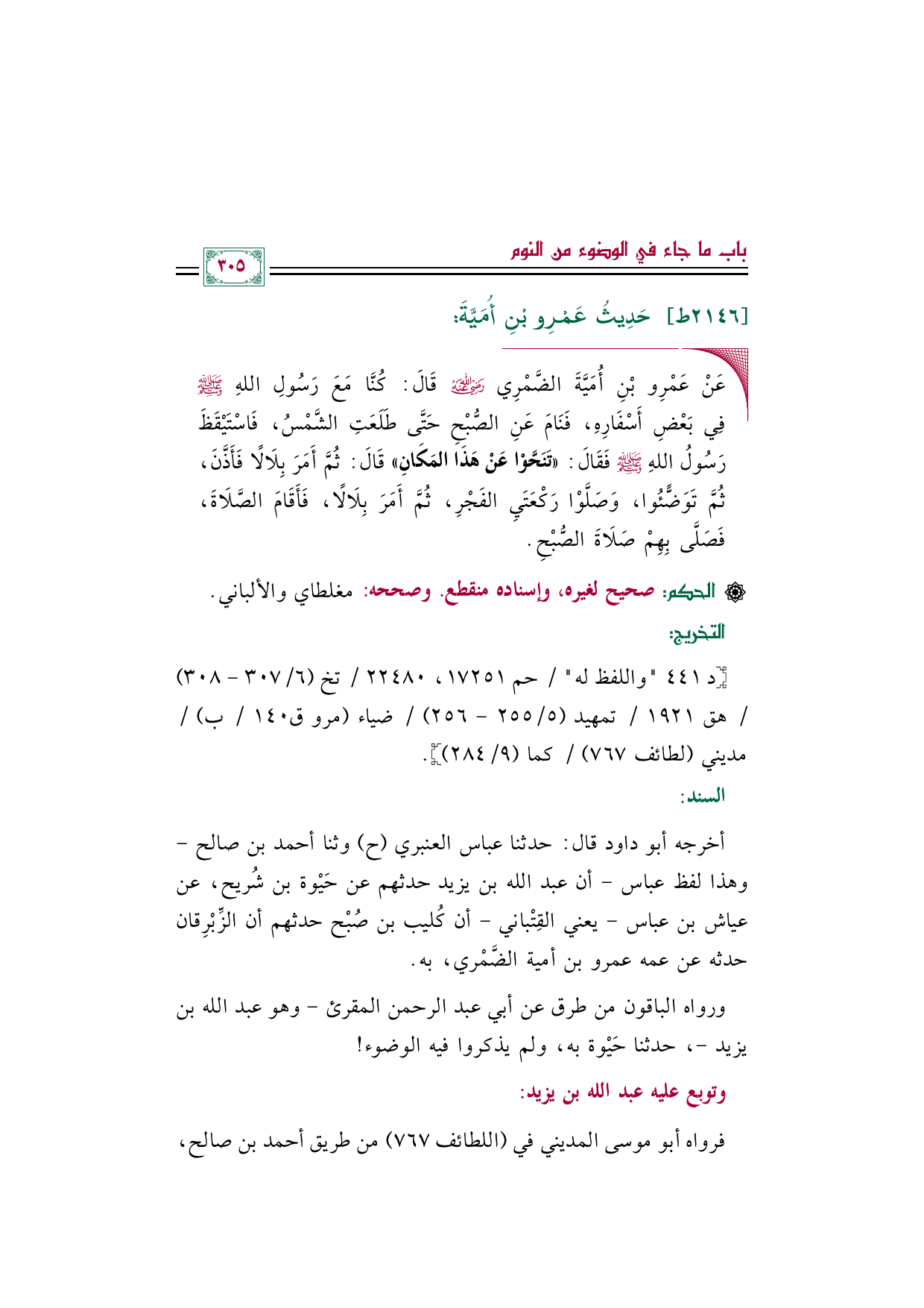 أخرجه أبو داود قال: حدثنا عباس العنبري (ح) وثنا أحمد بن صالح -وهذا لفظ عباس- أن عبد الله بن يزيد حدثهم عن حَيْوة بن شُريح، عن عياش بن عباس- يعني القِتْباني- أن كُليب بن صُبْح حدثهم أن الزِّبْرِقان حدثه عن عمه عمرو بن أمية الضَّمْري، به.